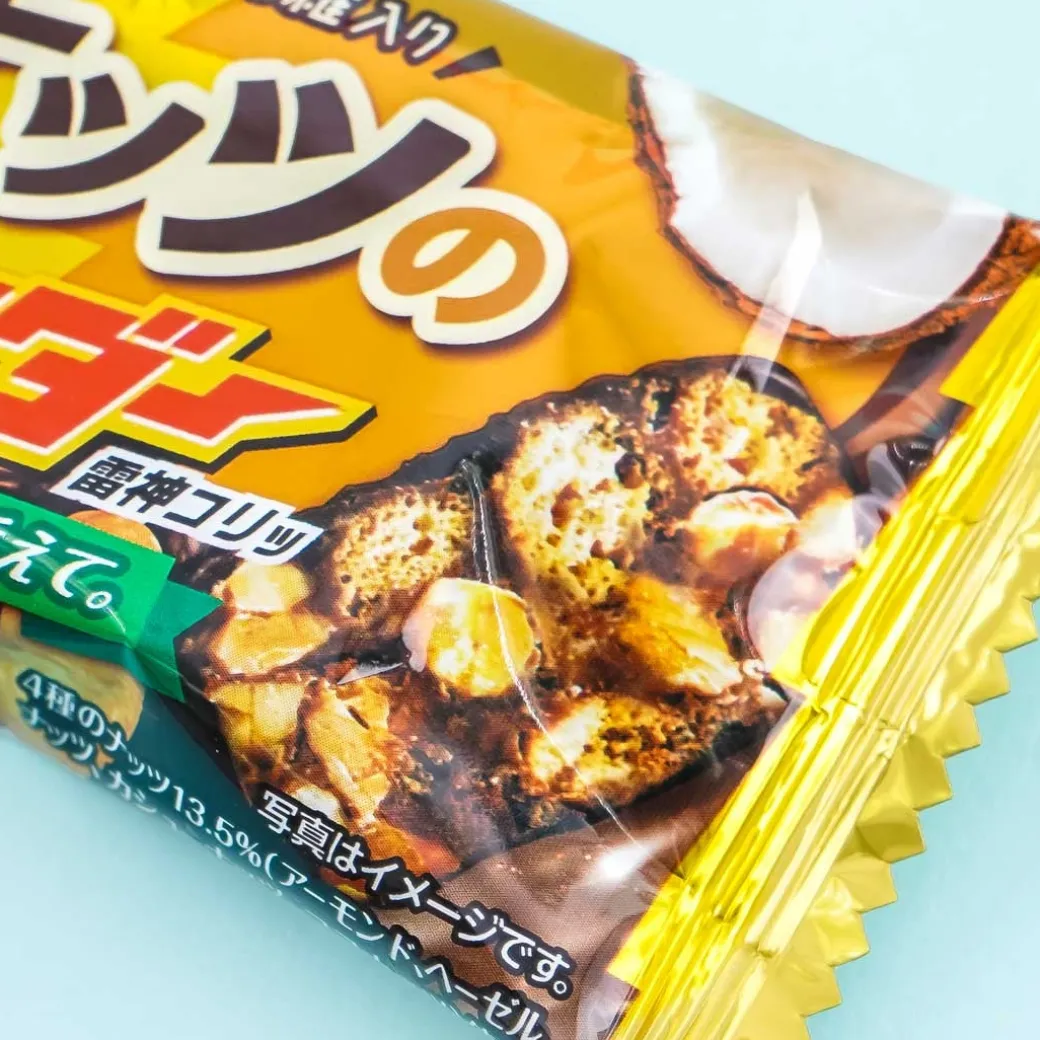 - A chocolate bar mixed with four kinds of nuts and bits of biscuits