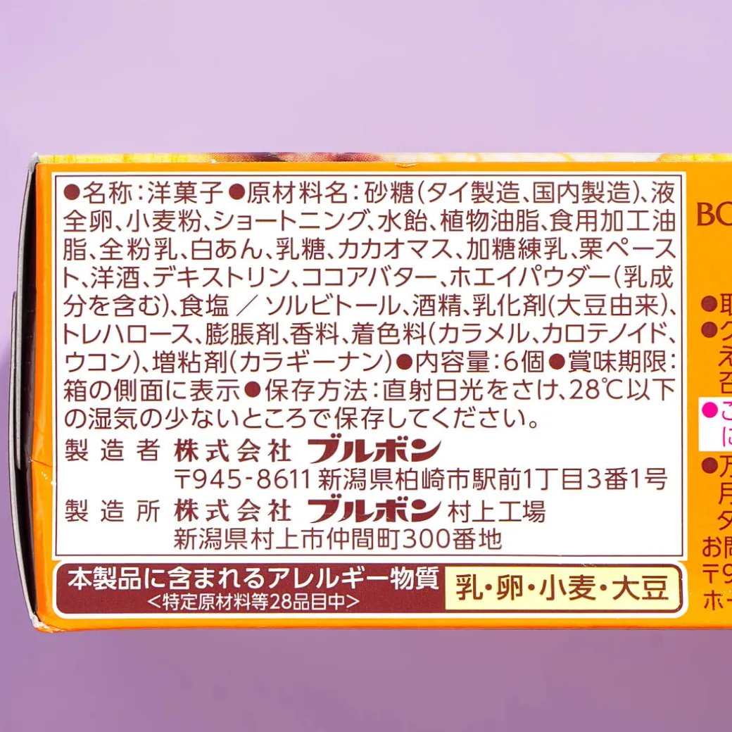 This soft Marron cake recreates the flavor of Japanese mont blanc. The fluffy cake bar has a chestnut paste filling and is topped with marron-flavored chocolate cream.