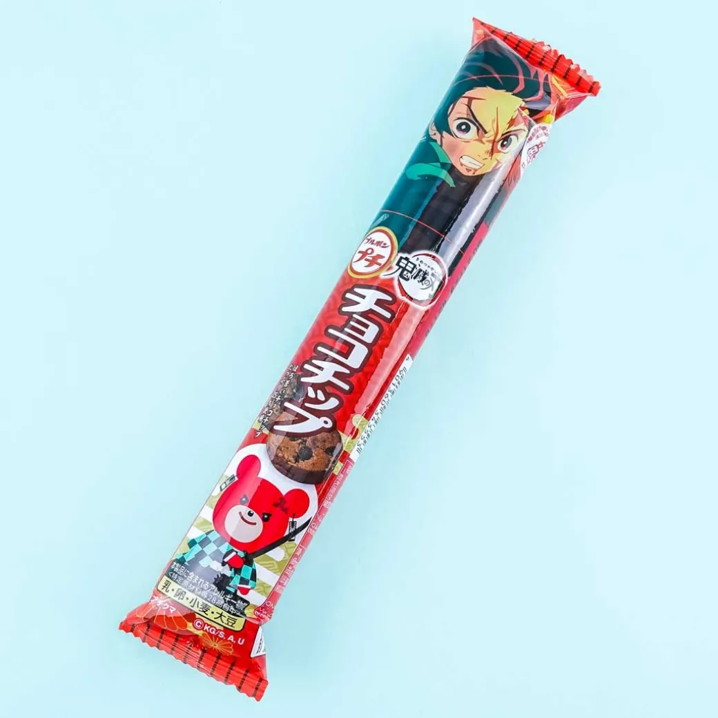 - A pack of cacao cookies with chocolate chips featuring prints of Tanjiro Kamado from Demon Slayer: Kimetsu no Yaiba