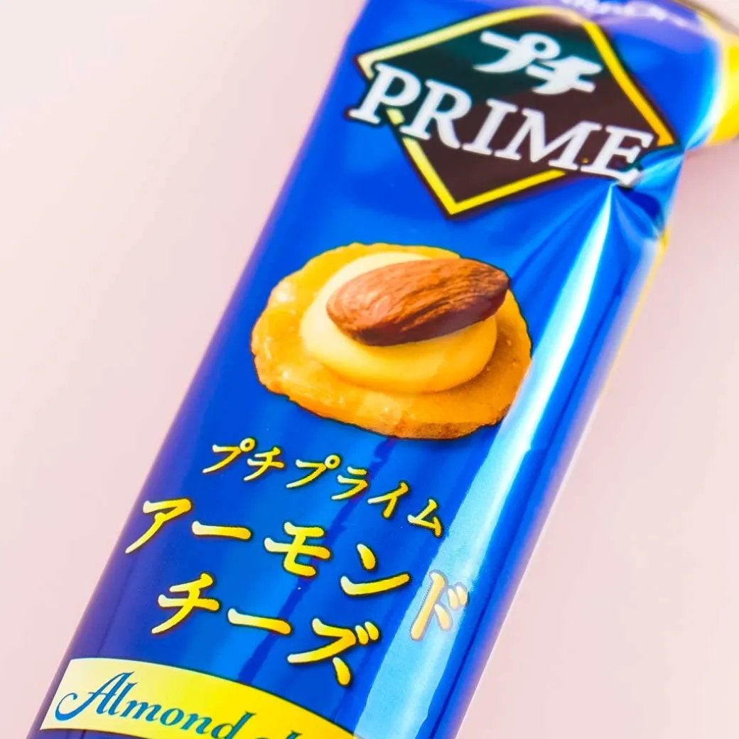 - A pack of bite-sized okaki rice crackers topped with cheddar cheese cream and almonds