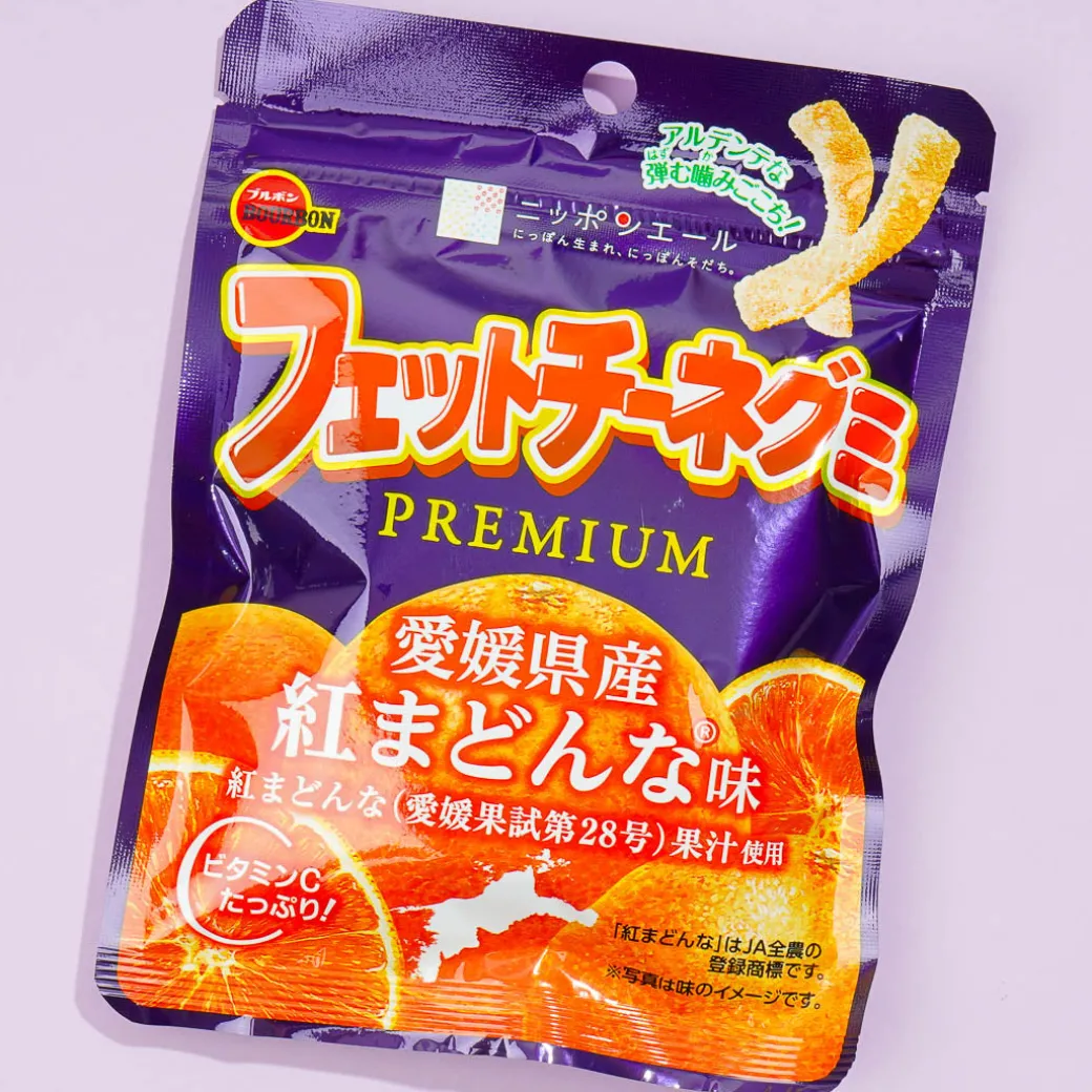 Let yourself indulge in the luxurious taste of sweet and juicy Beni Madonna oranges harvested from Ehime Prefecture as you try these gummies! Each fettuccine noodle-shaped soft candy is also generously coated with a mix of sugar and sour powder. You can take these yummy treats anywhere as they come in a resealable bag!