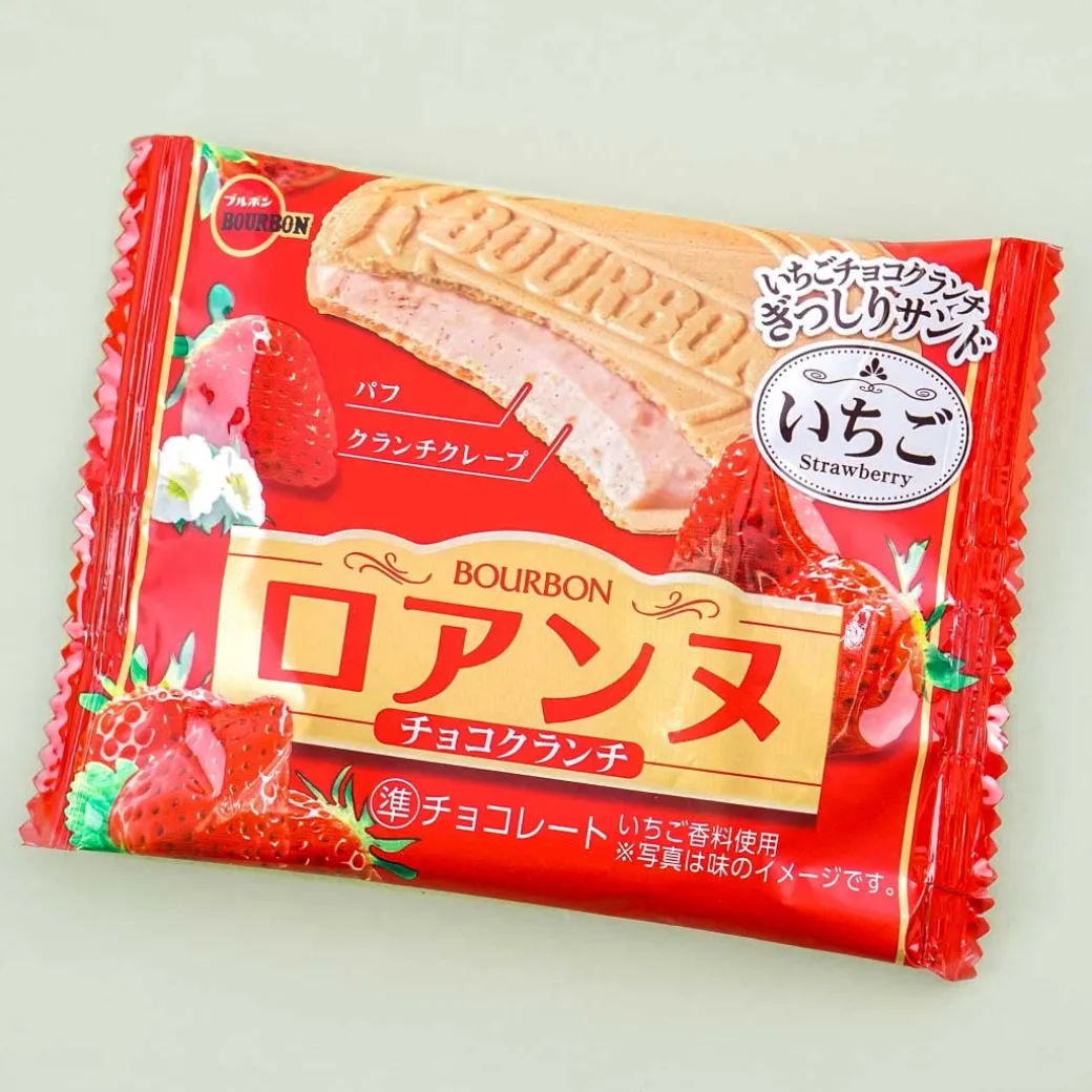 - A biscuit sandwich with a center made of strawberry chocolate, crunch crepe, and puff cream