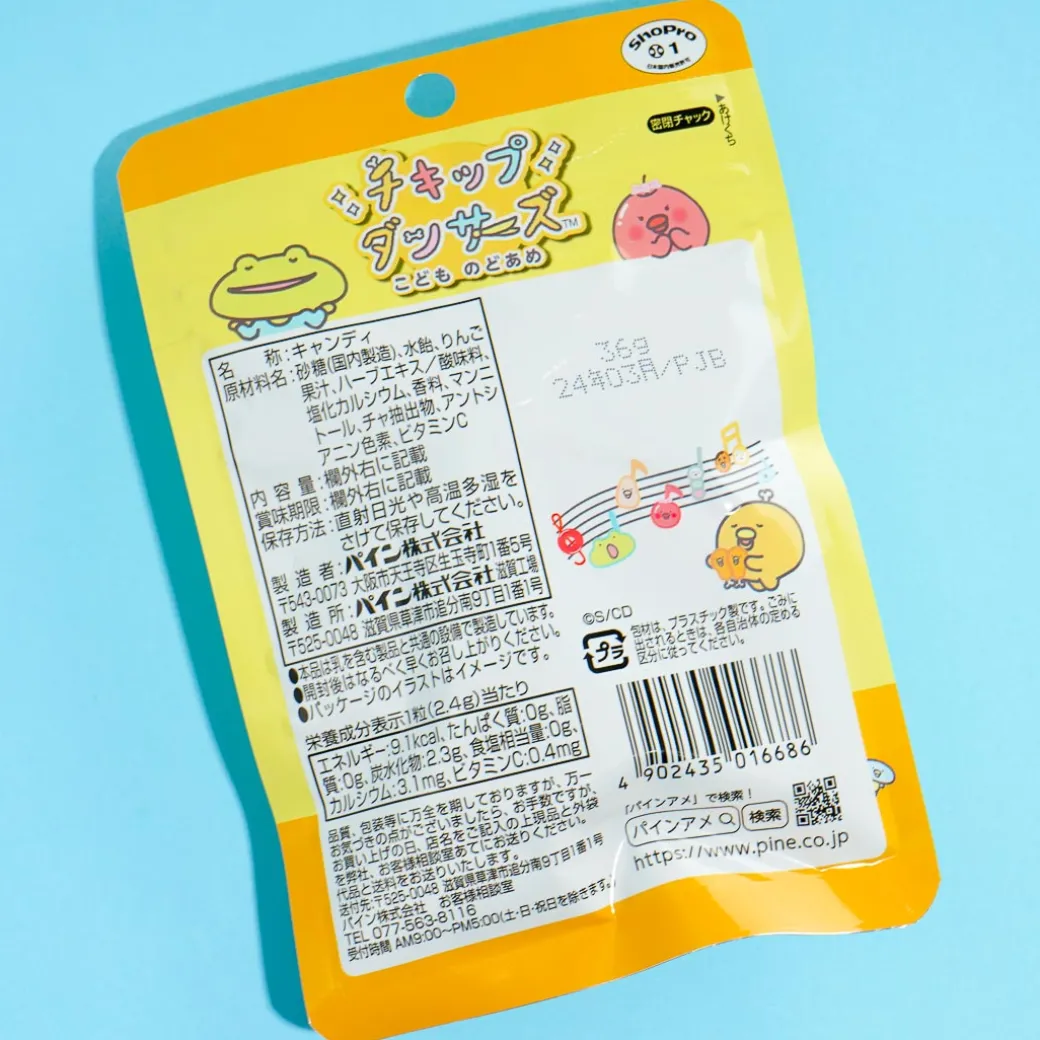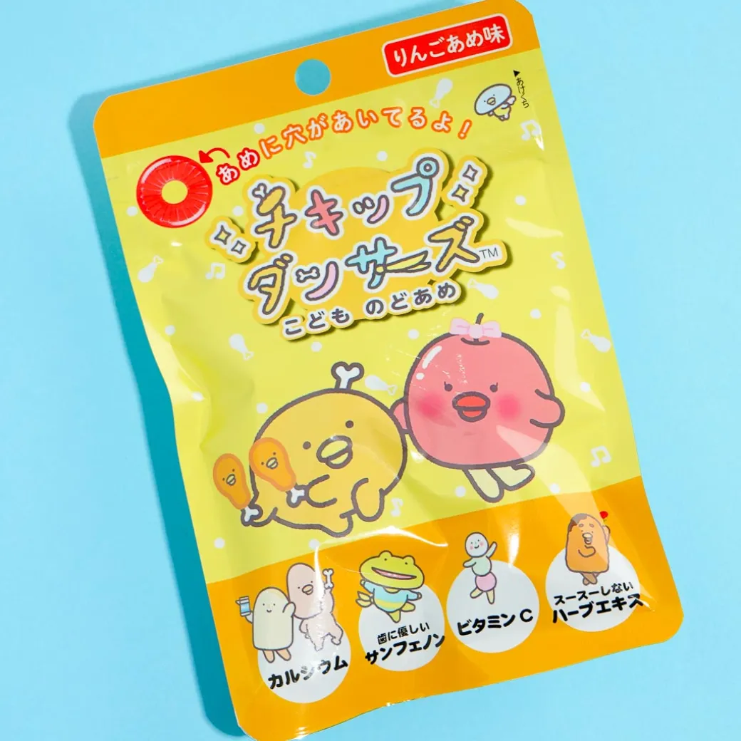 Give your throat a refreshing break with these donut-shaped lozenges! Each piece has a sweet apple taste! These candies come in a pouch that’s decorated with prints of Hone Chicken and Apple Candy, characters from the Chickip Dancers series.