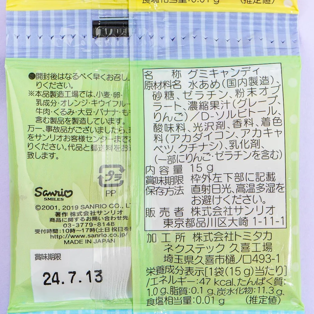 Enjoy these packs of heart-shaped gummy candies with your friends! They feature apple and grape flavors and come in cute packaging illustrated with Cinnamoroll and his buddies.