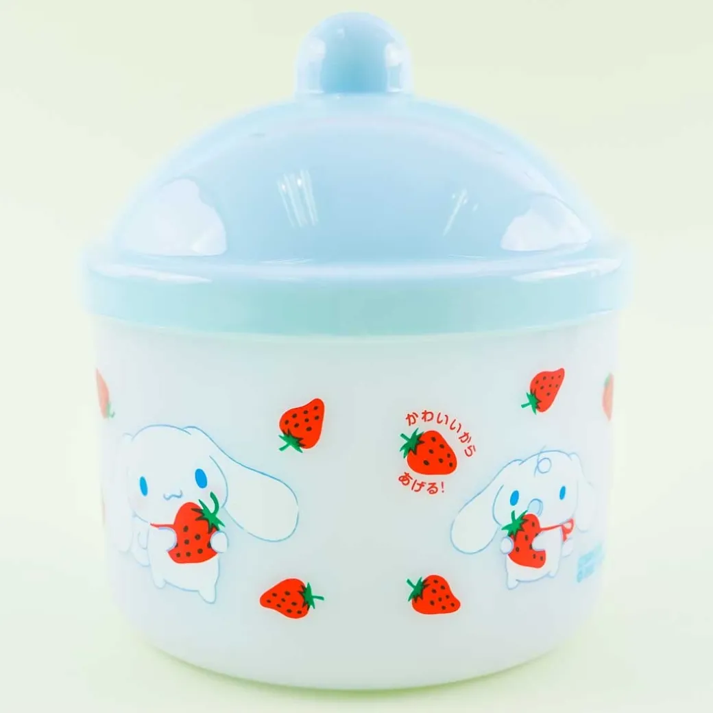 - A super cute mini reusable candy jar with prints of Cinnamoroll, Milk, and strawberries