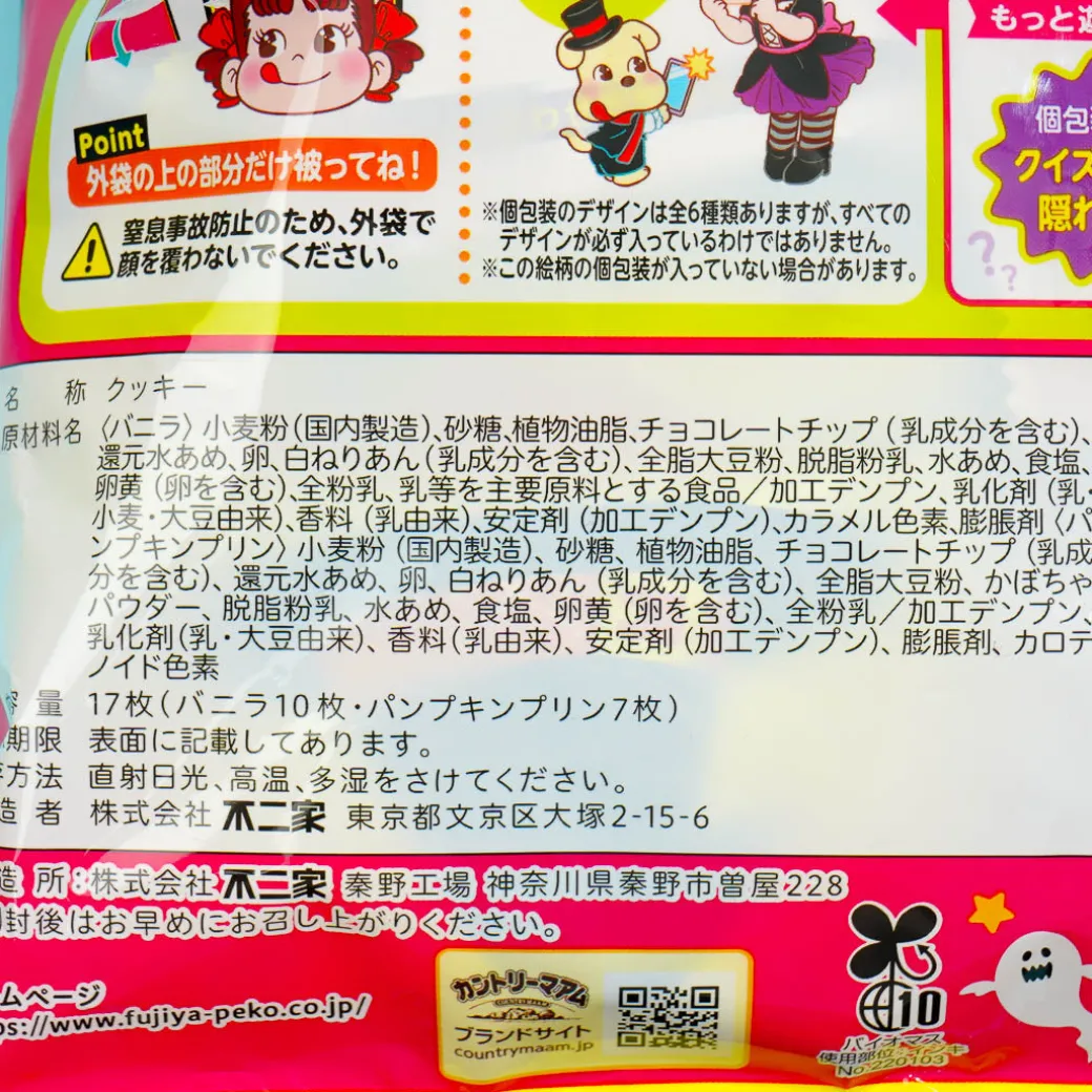 Enjoy the spooky season with this bag of assorted Country Ma’am cookies! This limited-edition assortment features classic vanilla and pumpkin pudding flavors. The packaging showcases a witch Peko-Chan for an extra touch of Halloween fun!