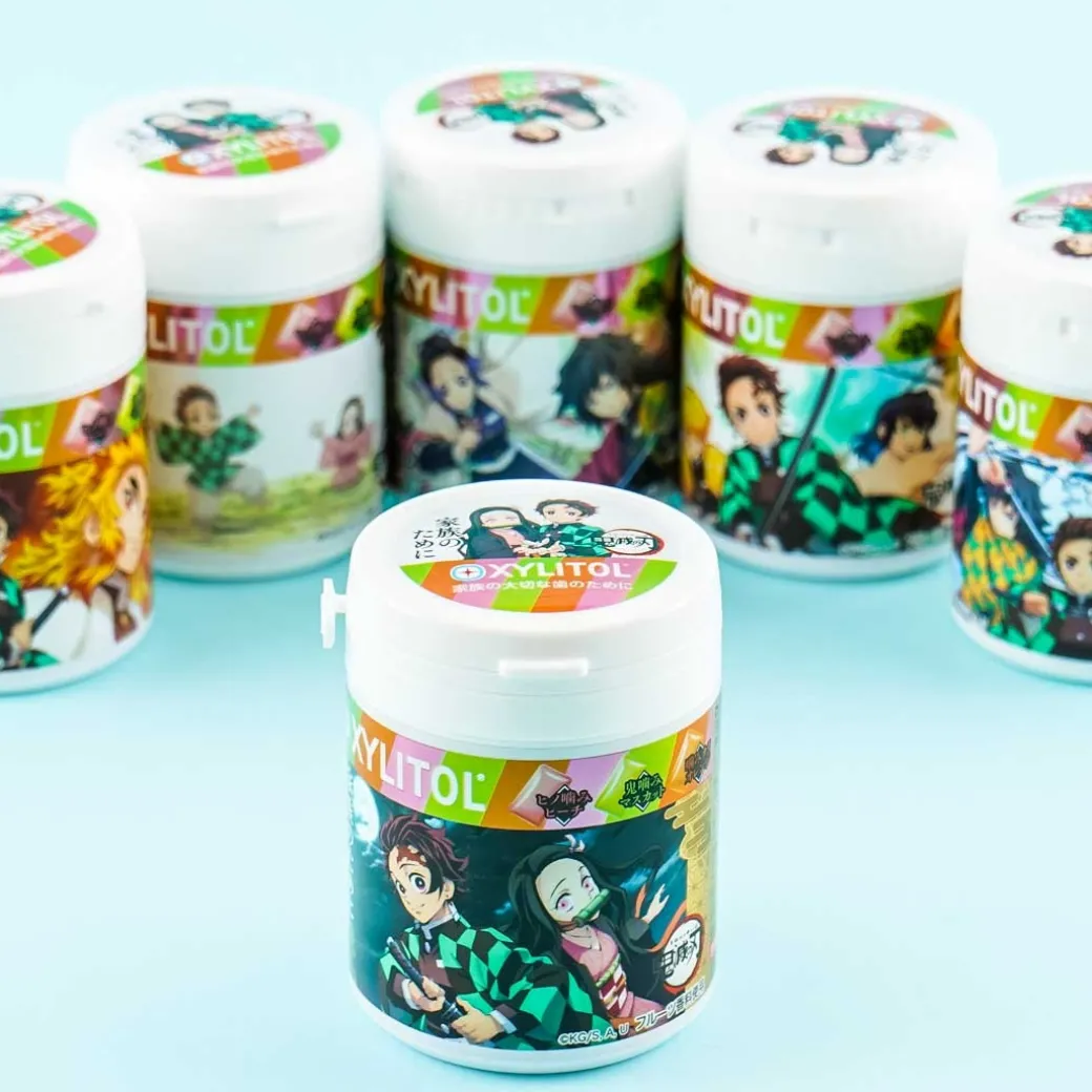 - A container of Demon Slayer peach, muscat and orange-flavored chewing gum made with xylitol