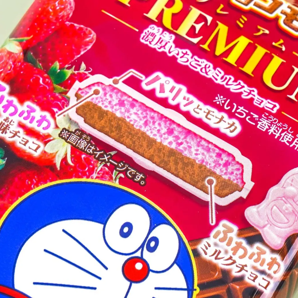 - A pack of Doraemon-shaped wafer sandwich filled with rich strawberry chocolate and milk chocolate