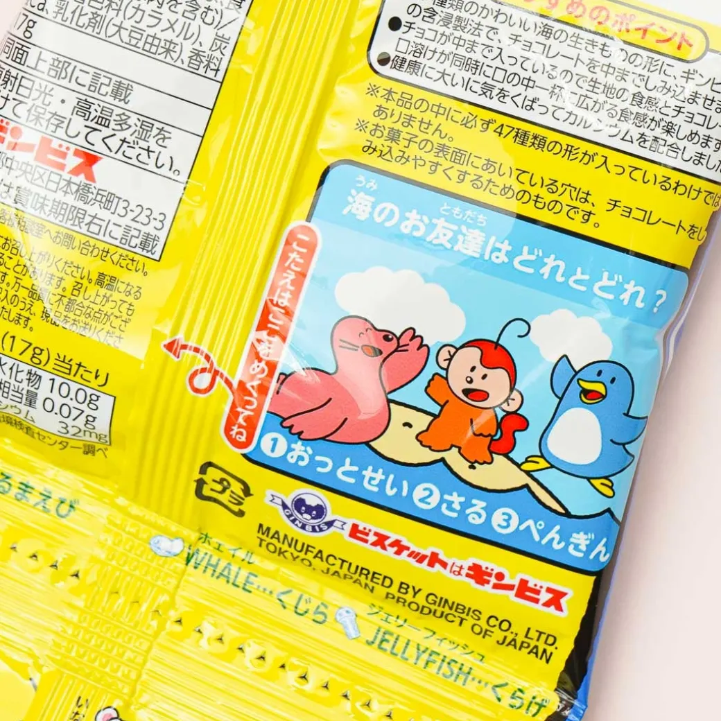 Share this five-pack set of chocolate biscuits with your besties! Each mini pouch contains crunchy biscuits that are shaped like different sea animals like seals, fish, dolphins, and more. A 5-pack set of chocolate biscuits that are shaped like various sea creatures Made in Japan by Ginbis