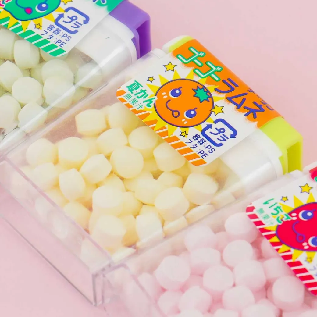 - A pack of ramune candies that comes in orange, apple, or strawberry flavors