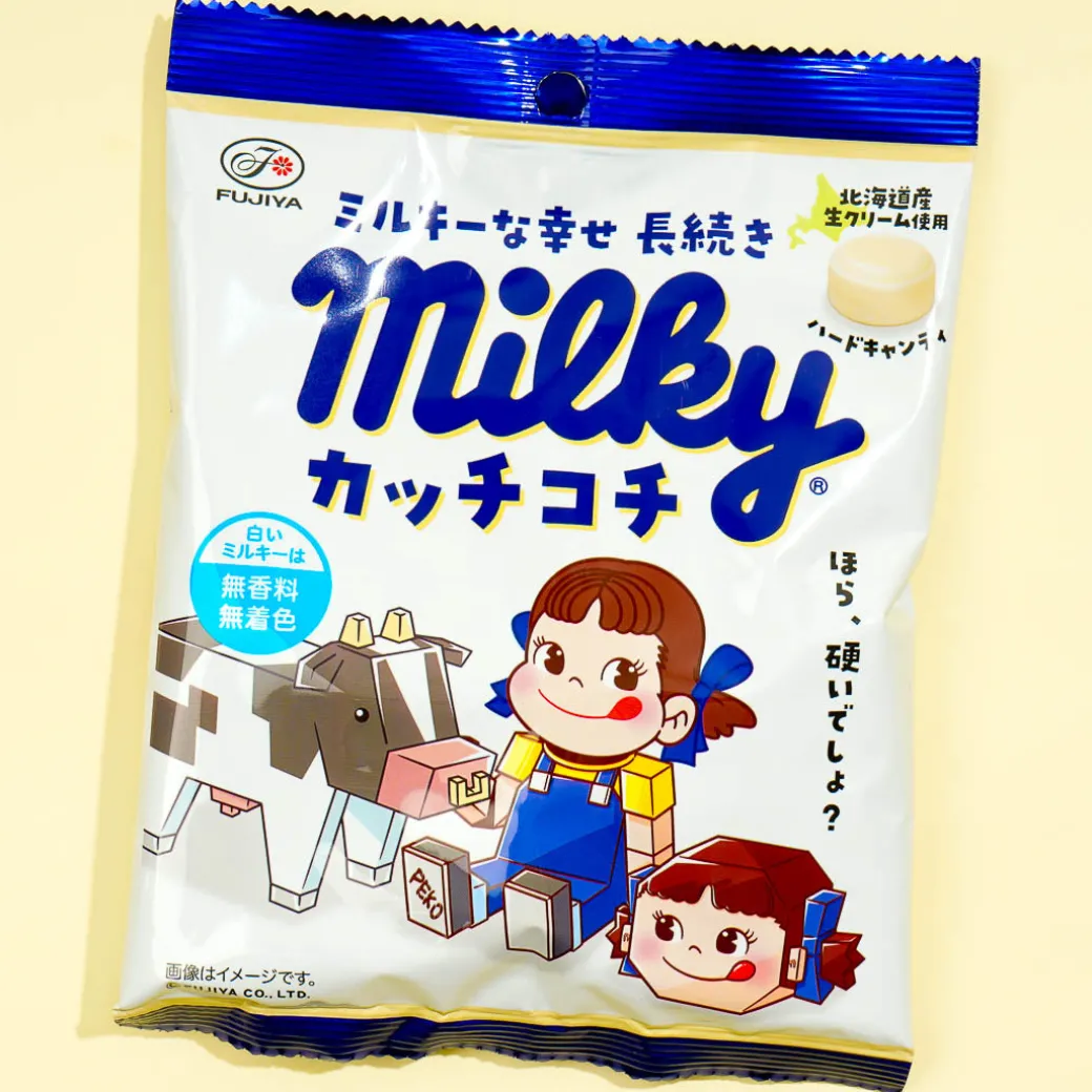 Enjoy this pack of unscented and uncolored milk candy with your friends! The packaging features a cardboard-shaped Peko-chan which you can cut out and place on your smartphone case.