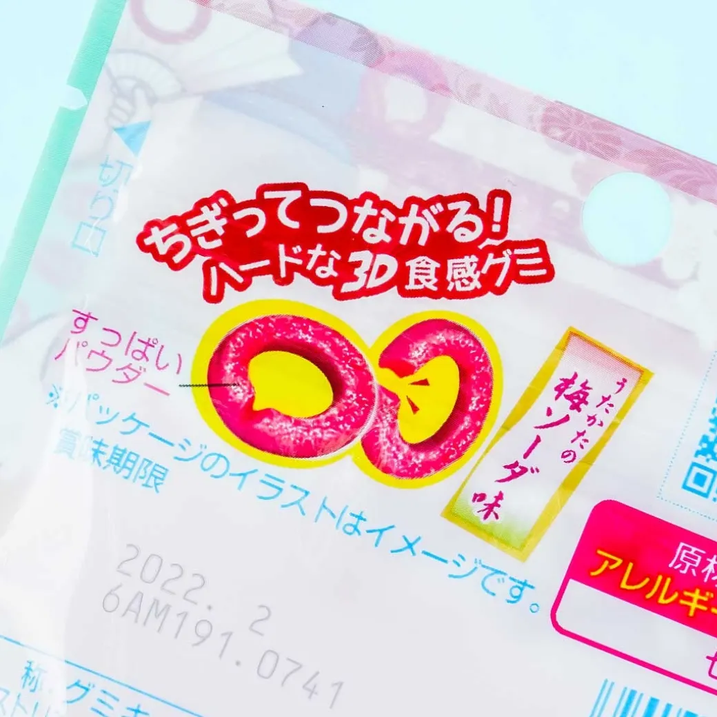 - A resealable pack of ring-shaped gummies with a plum soda flavor