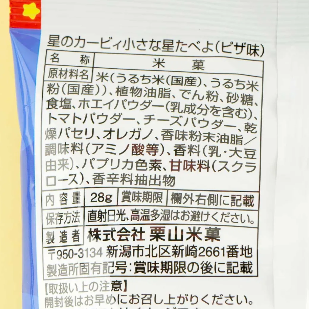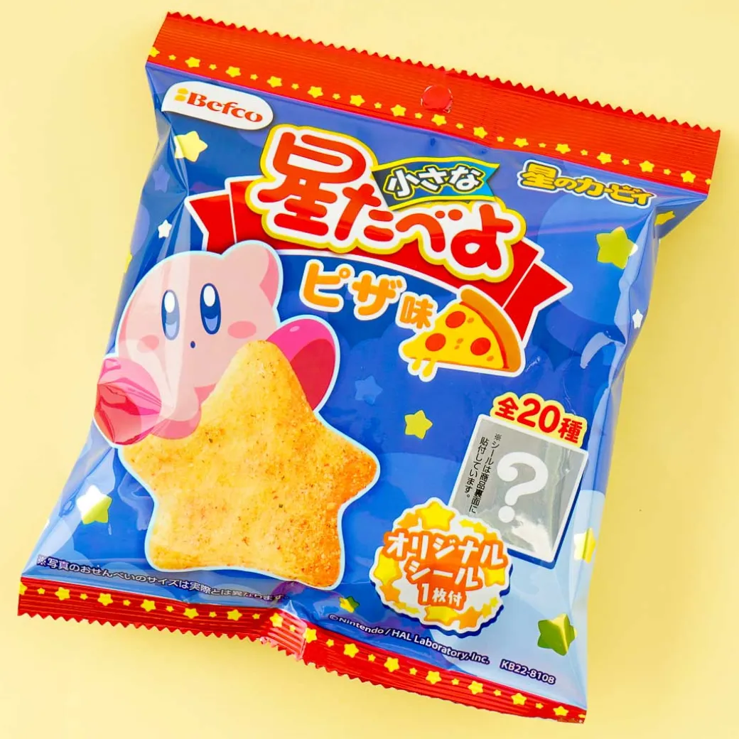 Have fun munching on these “hoshitabeyo” or star-shaped rice crackers that taste like pizza! These snacks come in packaging that features Kirby.