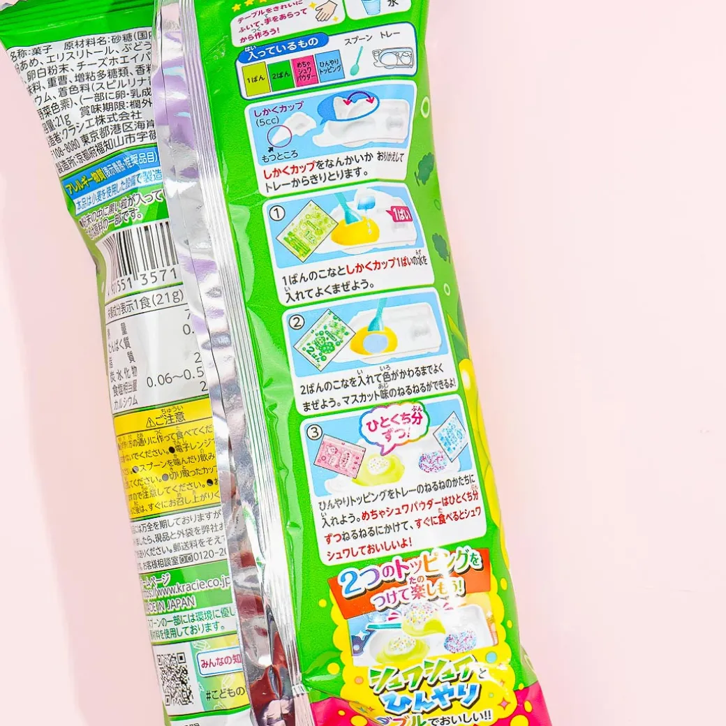 Have fun experimenting with this DIY candy kit! Simply add water and mix the powder. Then watch as the muscat-flavored candy changes color and becomes fluffy! This pack also comes with toppings that you can add as well!