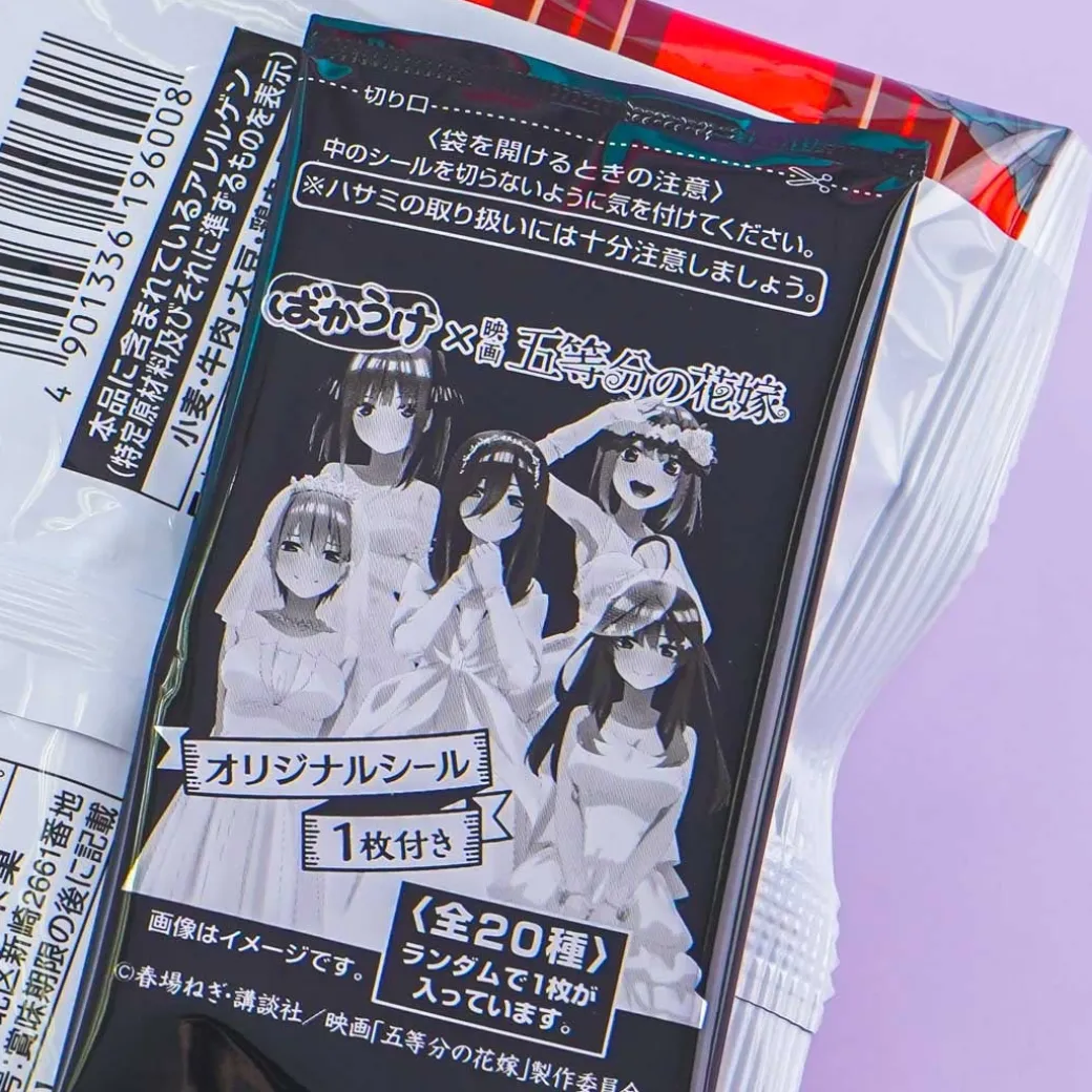 - A bakauke rice cracker pack illustrated with the popular anime Quintessential Quintuplets
