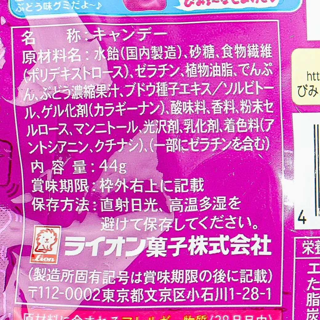 - A resealable pack of grape-flavored gummy candies made to look and taste like nata de coco