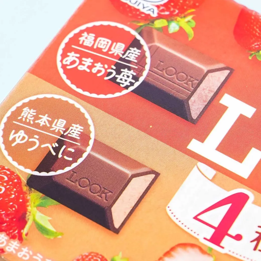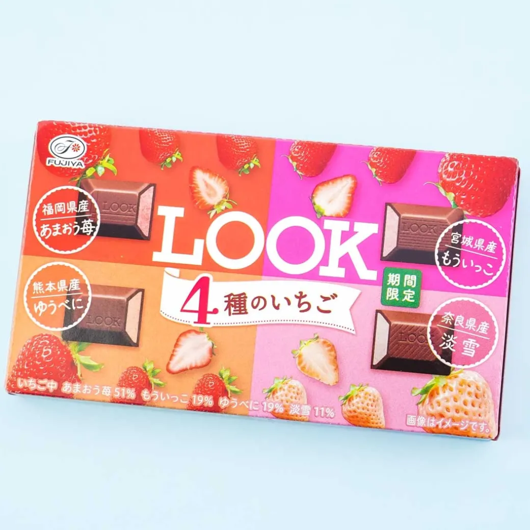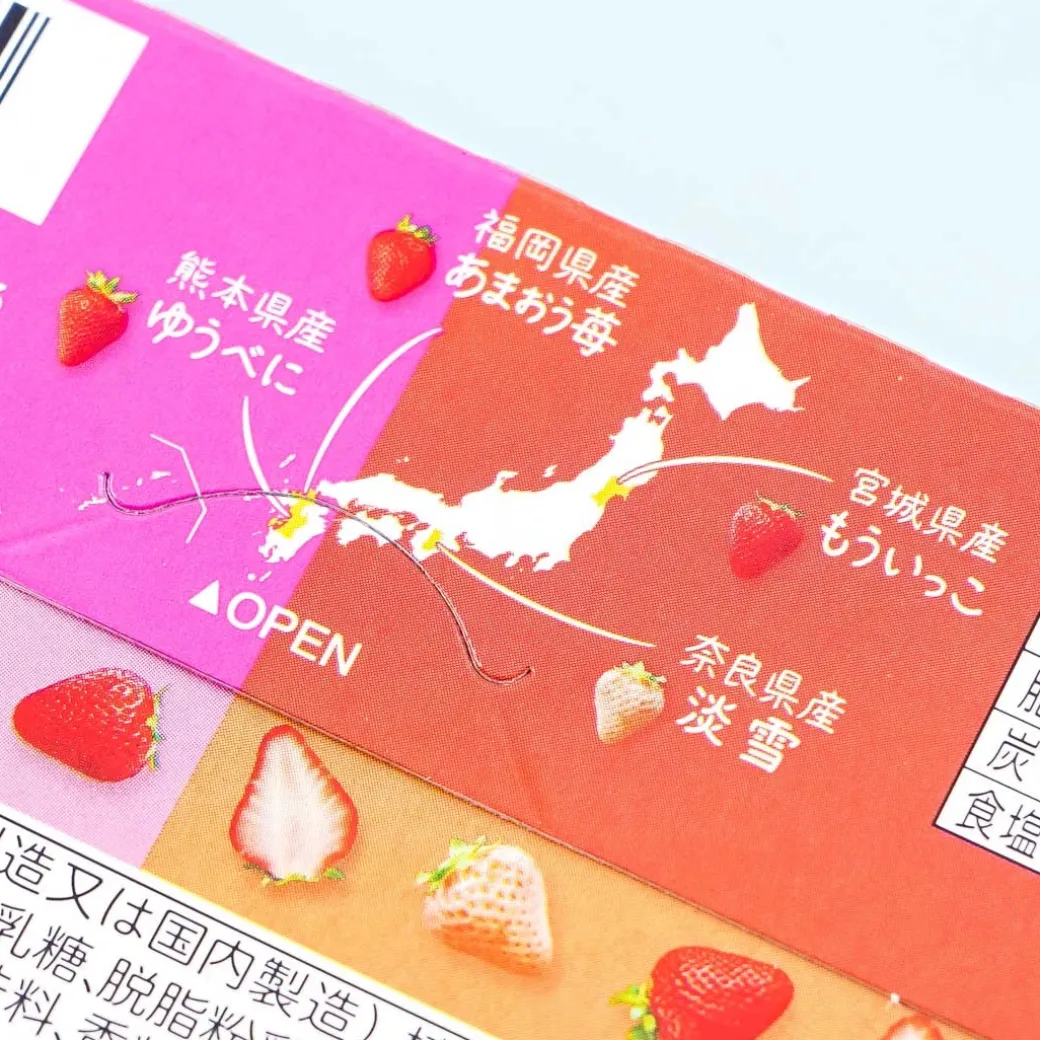 - A box of rich chocolate flavored with Amaou strawberry, Mouiko strawberry, Yubeni strawberry, and Light Snow strawberry