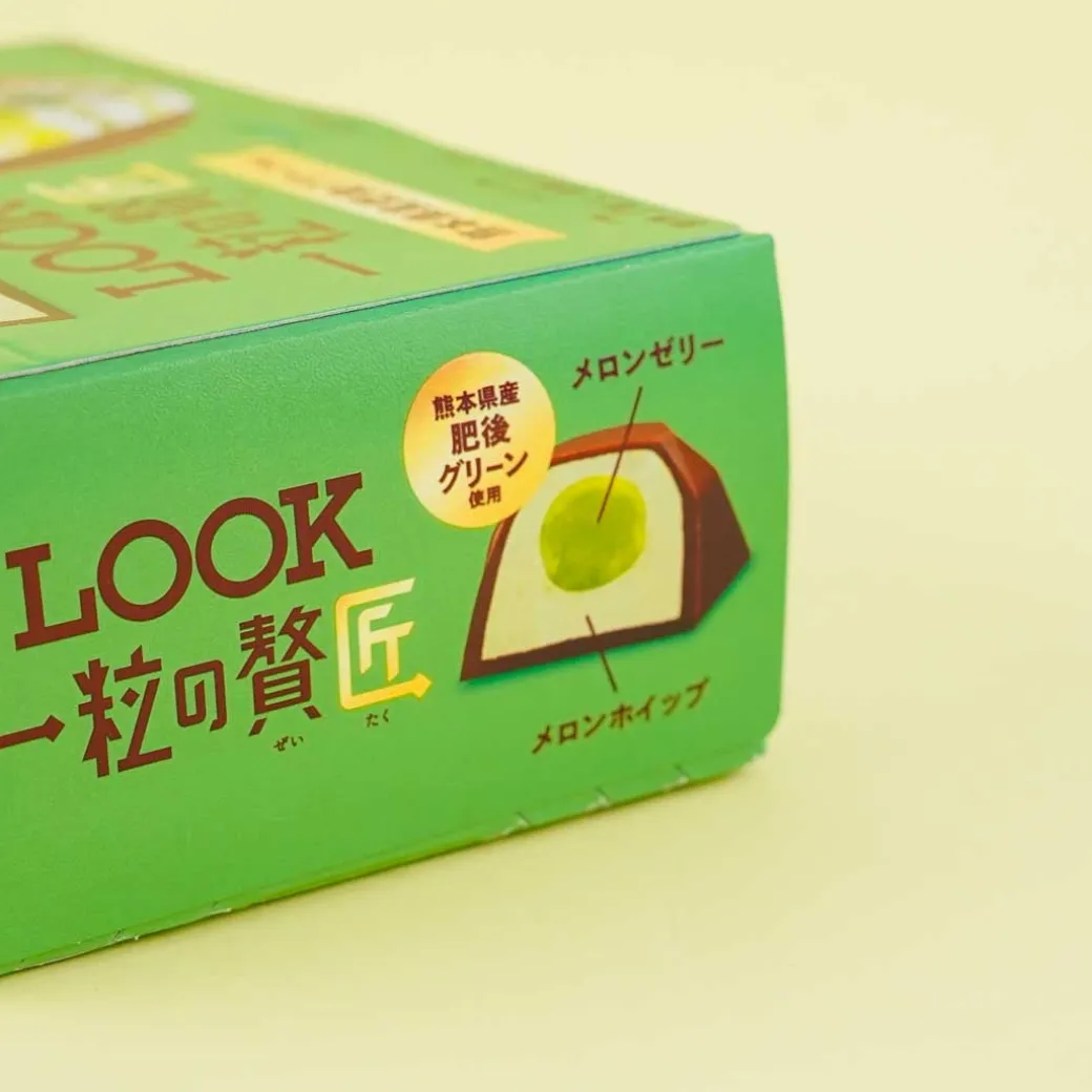 - A box of bittersweet chocolate bites filled with melon parfait-flavored cream filling