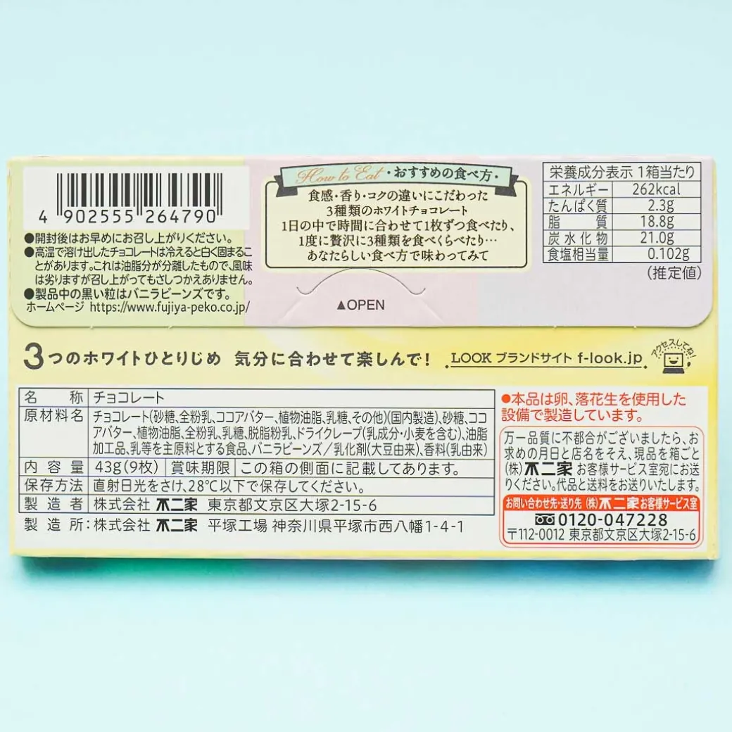 - A box of white vanilla chocolate with different textures, richness, and aromas