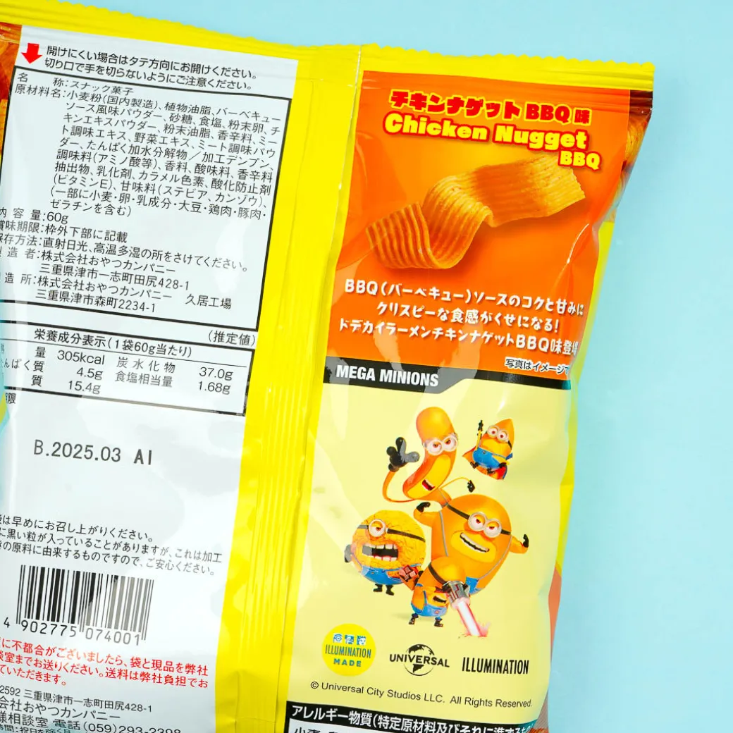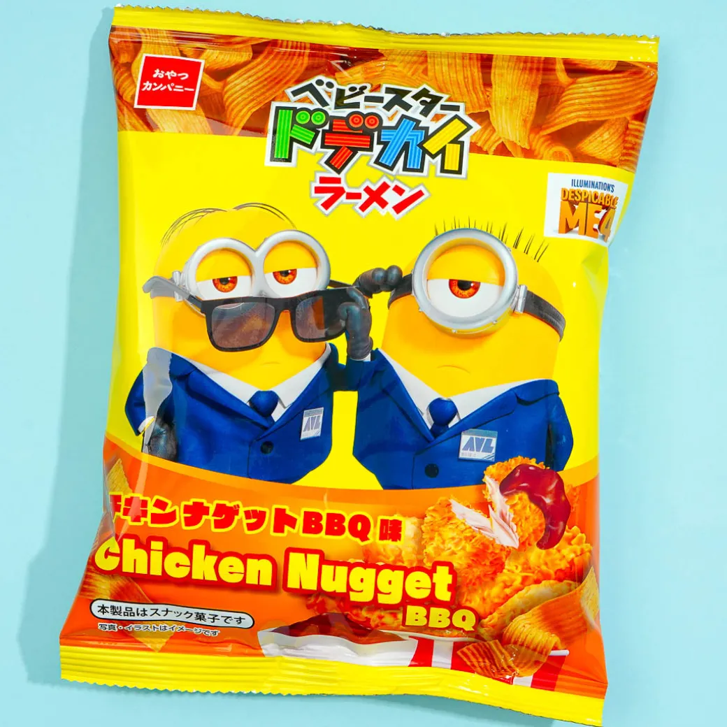 Tuck away this pack of wavy ramen noodle snacks in your cupboard! It features prints of characters from the Minions franchise dressed up as secret agents. Enjoy the delicious taste of chicken nugget BBQ with every bite.