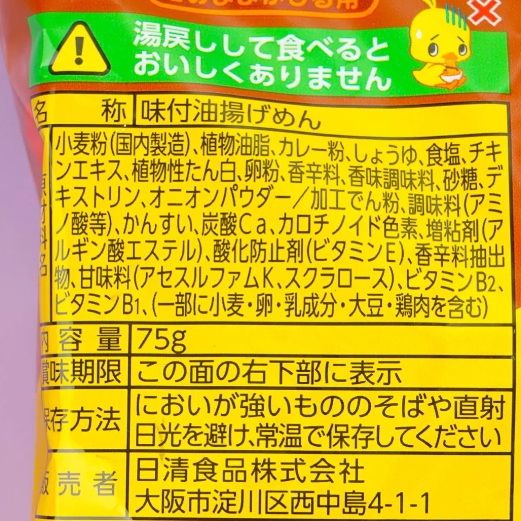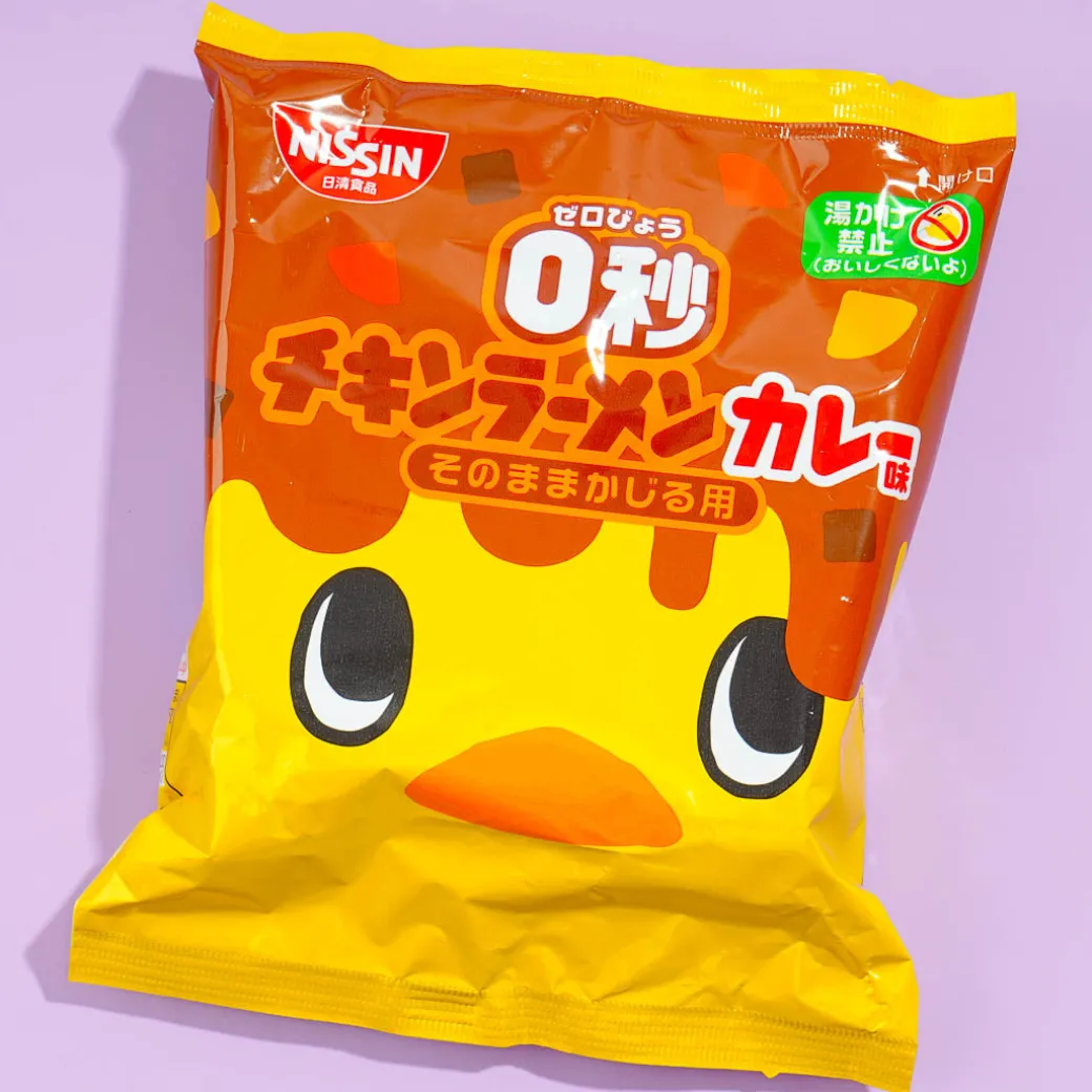 Enjoy nibbling on this ramen noodle snack! It’s a chicken ramen that can be eaten as is so there’s no need for hot water. This crispy snack is seasoned with soy sauce-based chicken soup and curry powder.