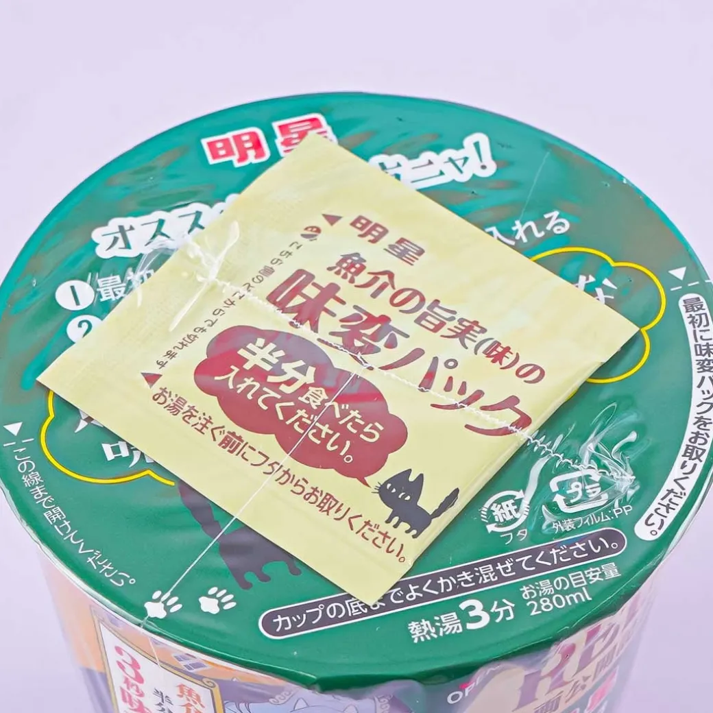 - An instant red ramen cup that has a tomato consommé flavor and is packed with dried veggies and minced meat