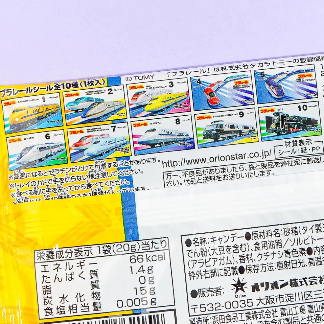This yummy gummy candy is shaped like Plarail, a popular toy train in Japan. There are 6 cider-flavored gummies and a free sticker for you to enjoy!