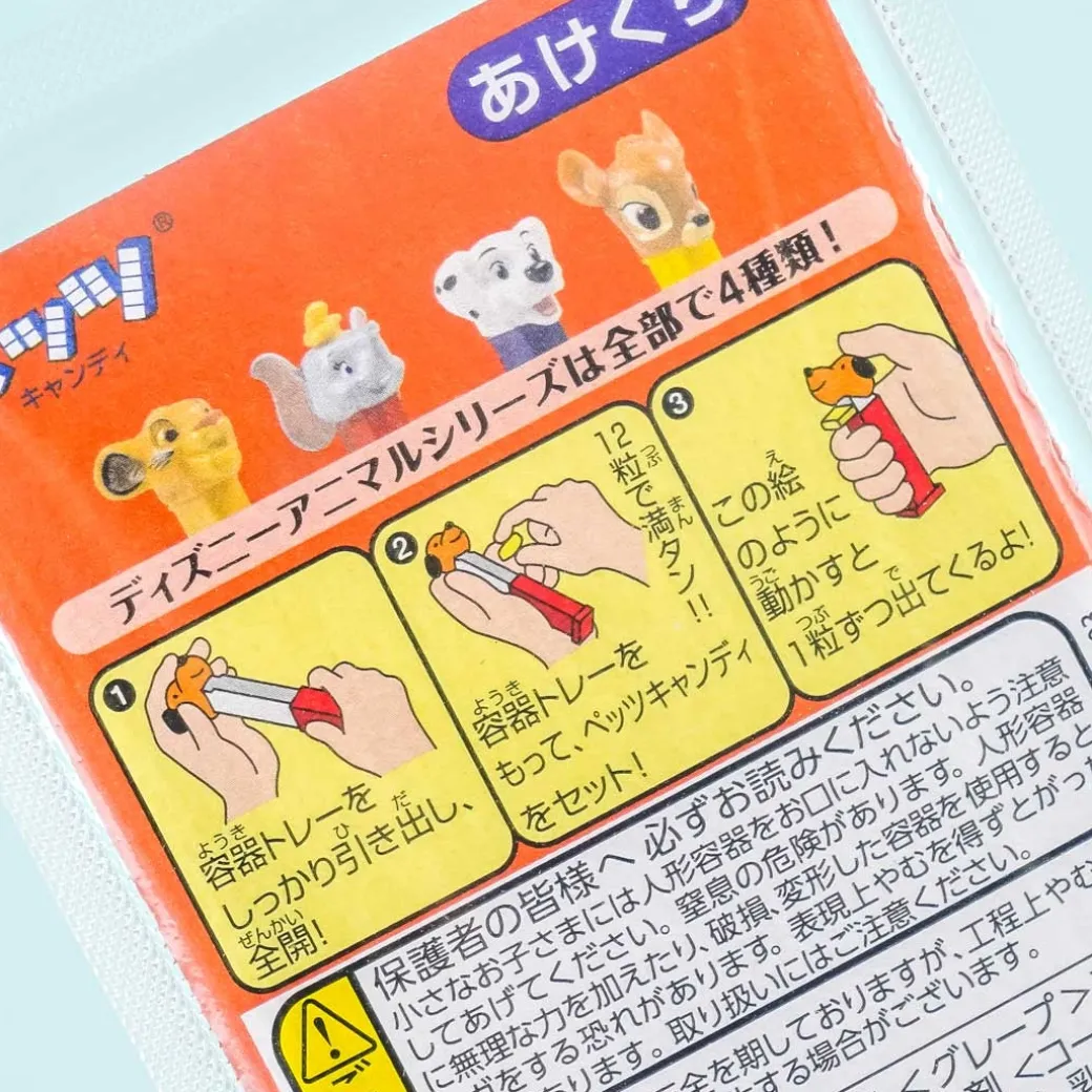 - A pack of grape and cola-flavored candy with a PEZ dispenser featuring Bambi
