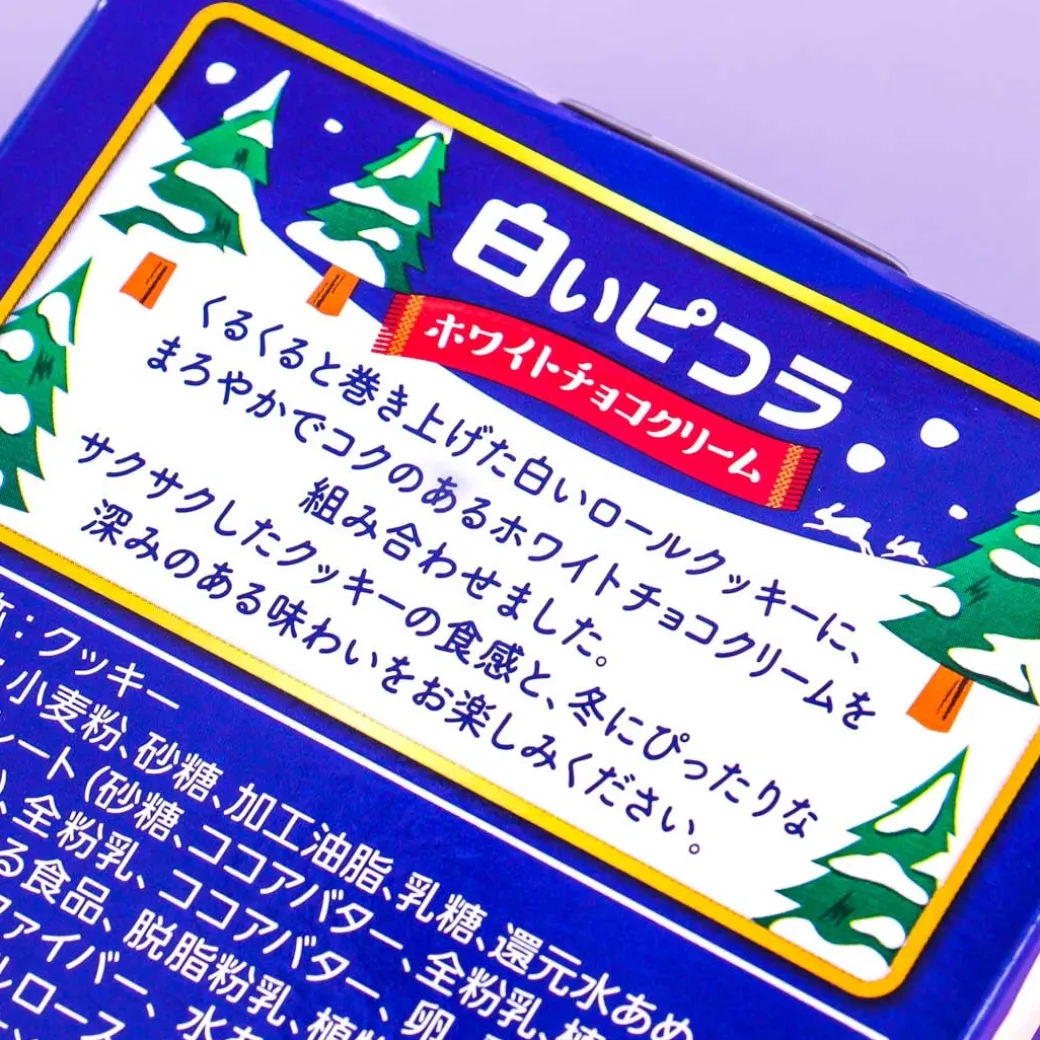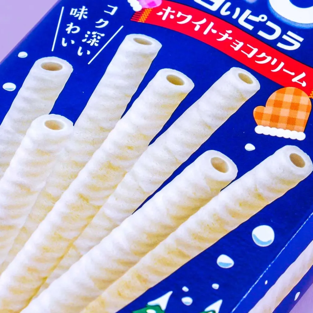 - A box of crispy egg roll sticks with white chocolate cream filling