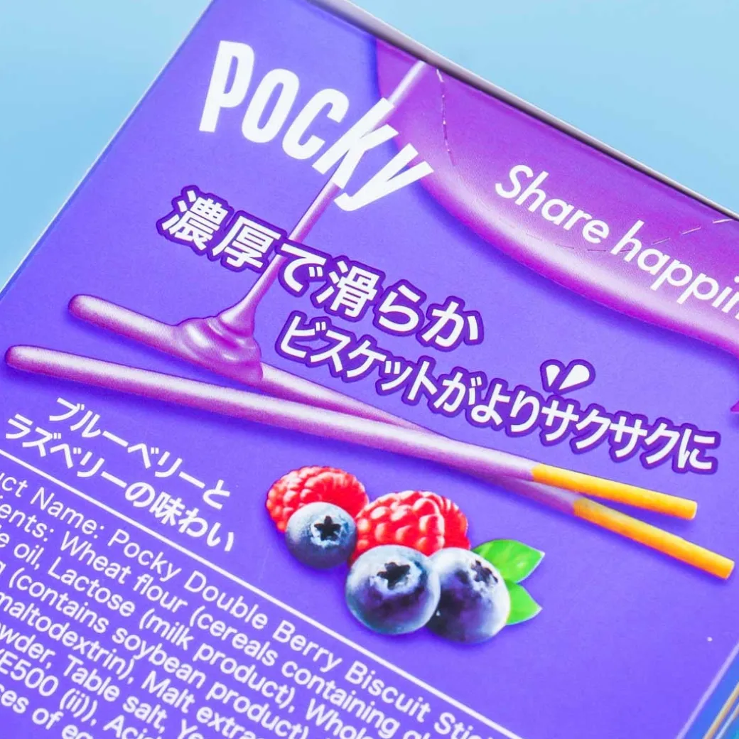 - A pack of crunchy stick biscuits with sweet blueberry and raspberry flavors