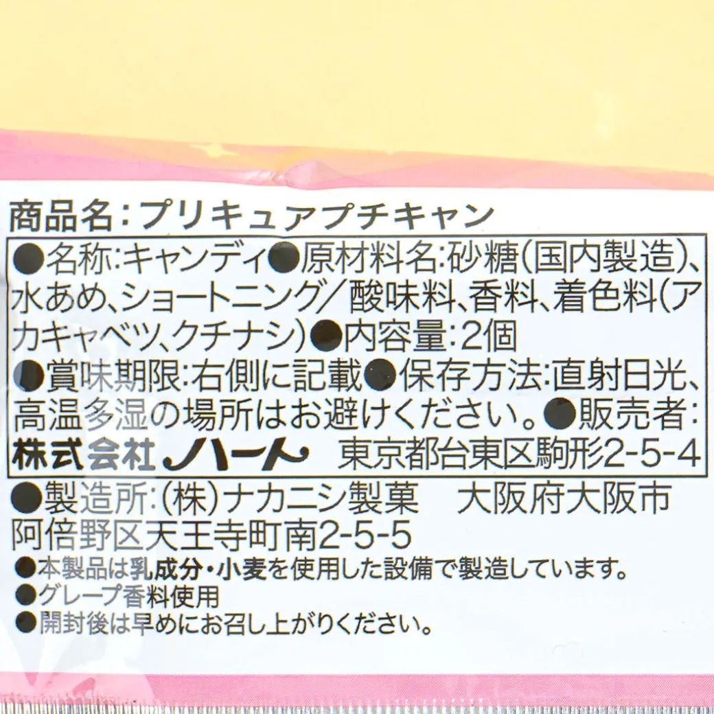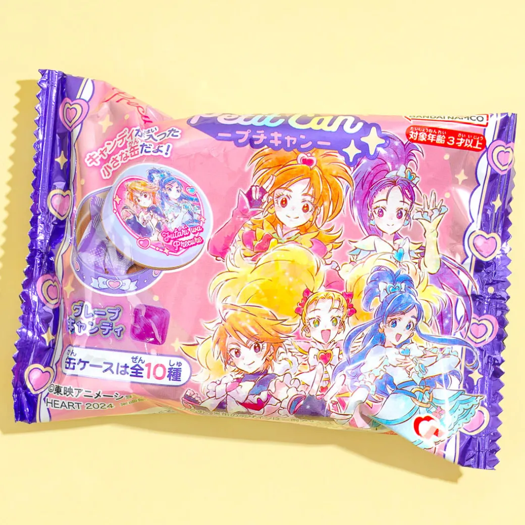 This super cute tin can contains two grape-flavored candies! It features kawaii illustrations from the anime Pretty Cure. After enjoying the sweet treat, you can use the can to keep your trinkets!
