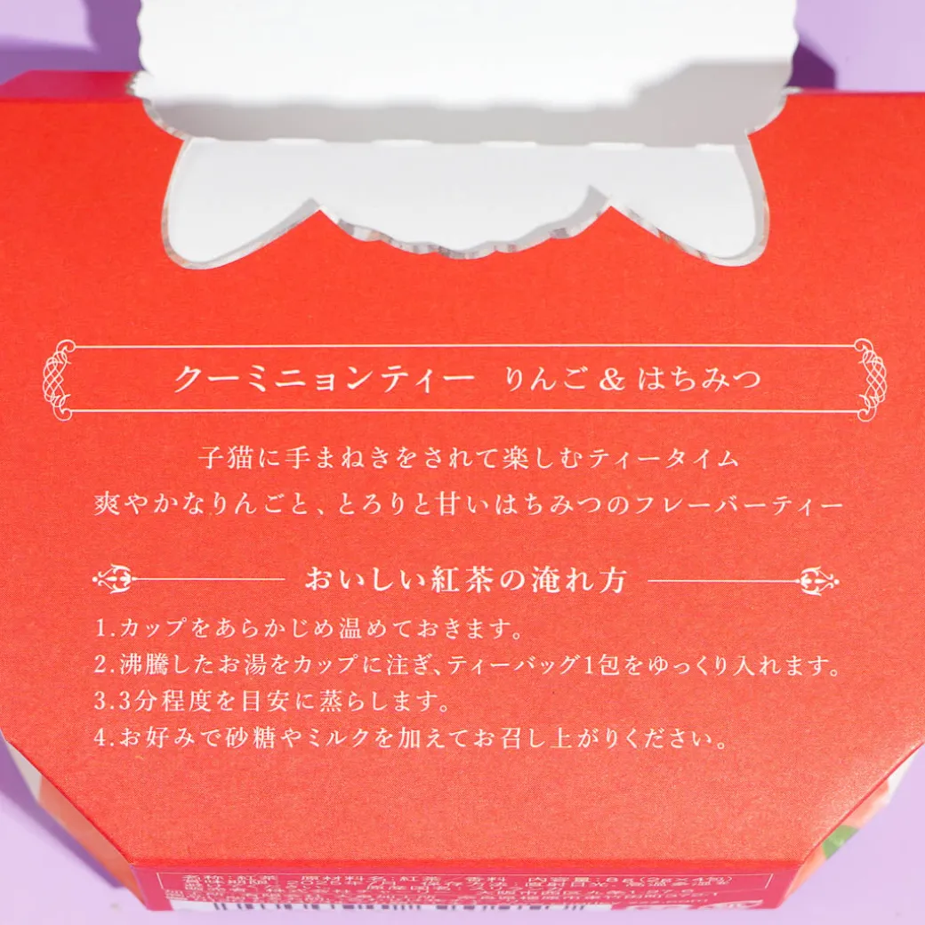 This pack of tea bags features a print of a cute cat inspecting a cup of tea! Add it to your tea cabinet. Each tea bag makes for a nice cup of apple and honey-flavored tea.
