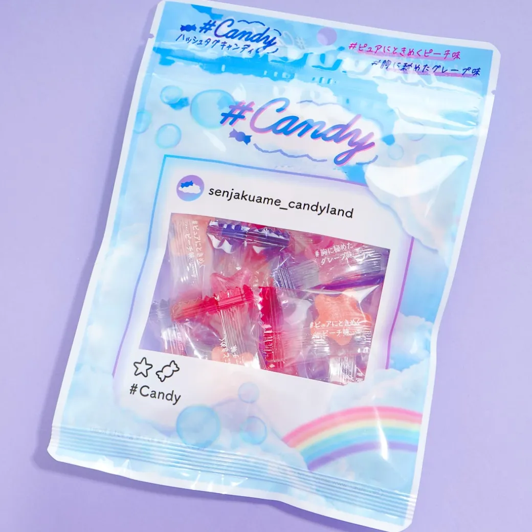 Take photos and enjoy the sweet taste of this pack of kawaii star-shaped candies. Each piece is filled with grape or peach flavor. The packaging features a print of a social media post with #Candy written on it.
