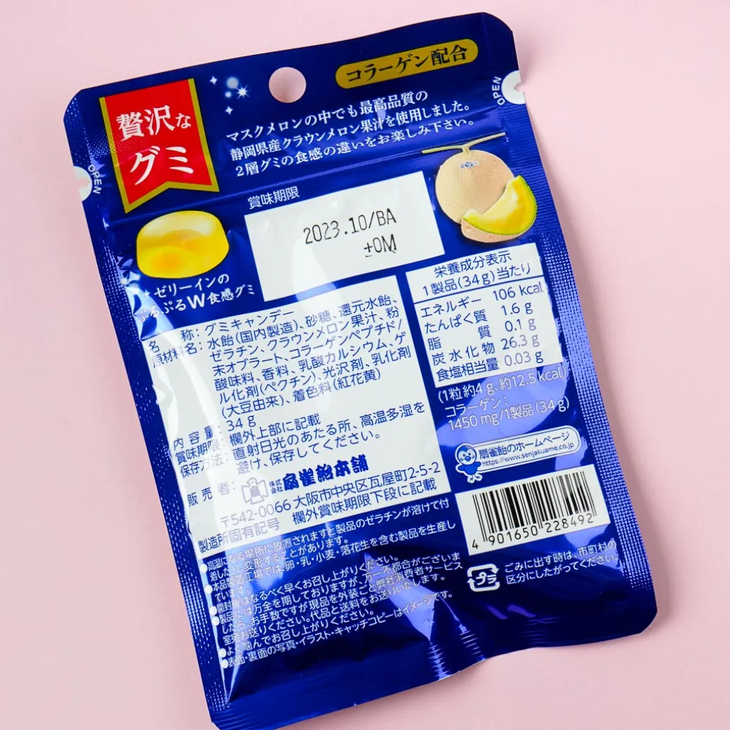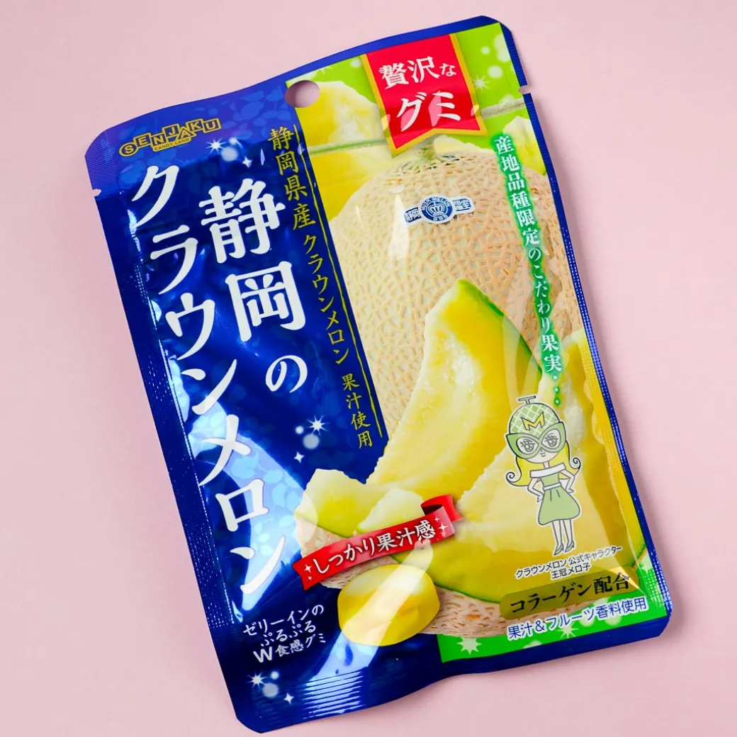 Enjoy these yummy gummy candies from Senjaku! It showcases their specialty, the crown melon from Shizuoka Prefecture in Japan. These gummies have a fruity jelly center and even contain collagen to help promote good health.