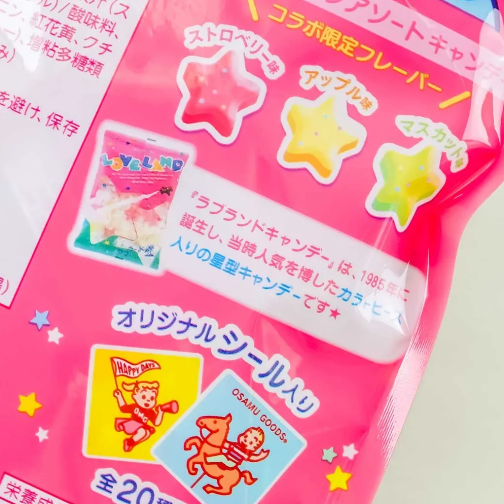 - A bag of individually wrapped star-shaped hard sweets with colored candy beads from OSAMU GOODS