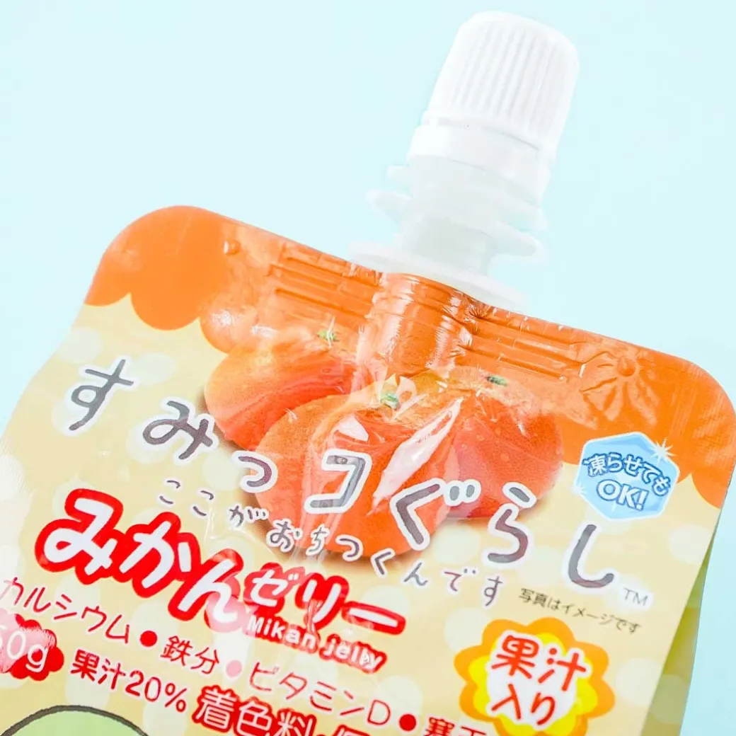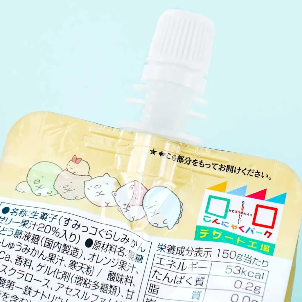 - A pack of orange jelly juice drink featuring the Sumikko Gurashi characters