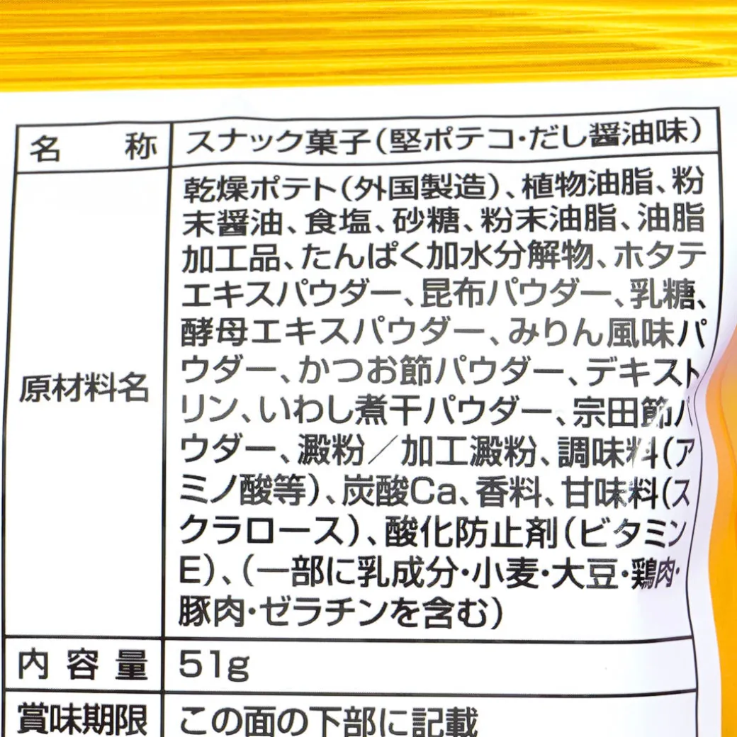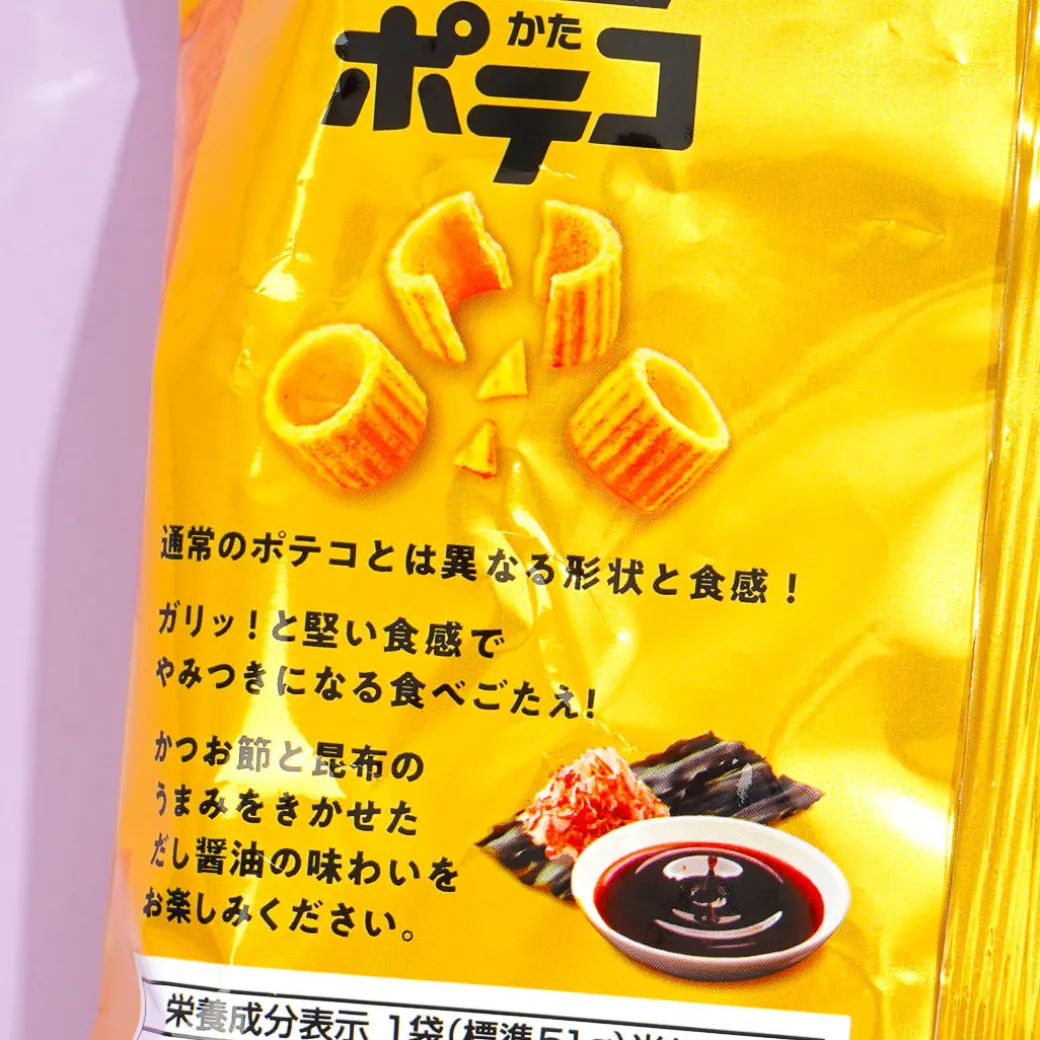 Nibble on these hard, jagged potato rings! They’re super crunchy and addictive. Each piece is coated in a powder that combines the umami of bonito flakes, kelp, scallop dashi, and soy sauce.