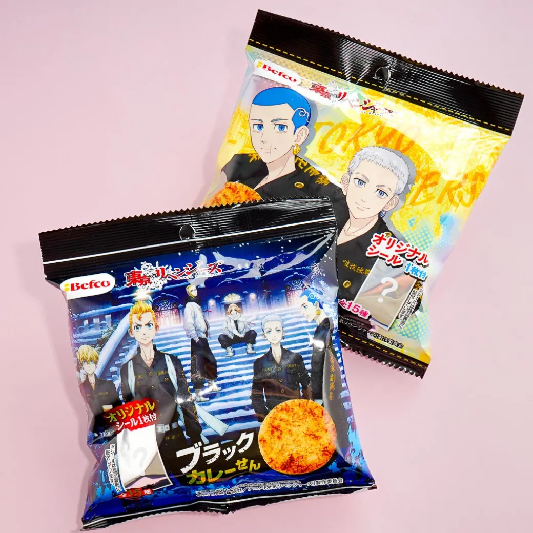 Have an anime marathon with this black curry-flavored pack of senbei or rice crackers! The packaging features characters from Tokyo Revengers and it comes with a surprise design when you order.