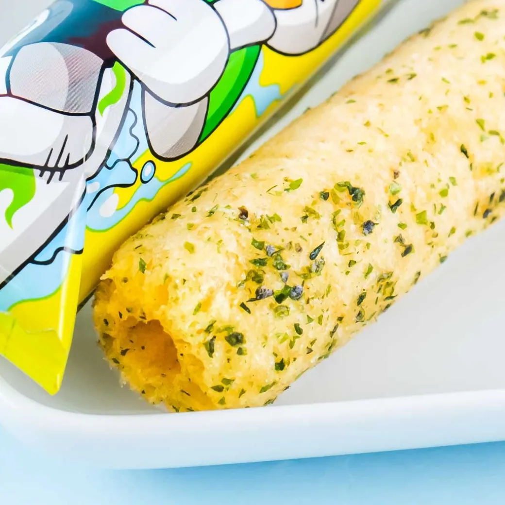 - A set of puffed stick-shaped corn snacks with salt and seaweed mix flavors