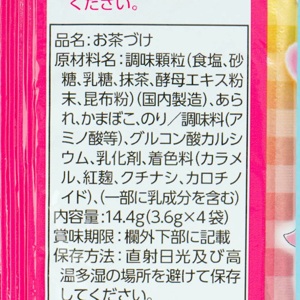 Enjoy a delicious bowl of ochazuke, a traditional Japanese rice dish made with hot green tea and savory toppings! This ochazuke pack is made with dried nori, special seasoning, and kamaboko or dried seafood bits with cute prints. The packaging features a cute illustration of the anime Wonderful Pretty Cure. It even comes with a Pretty Cure sticker!