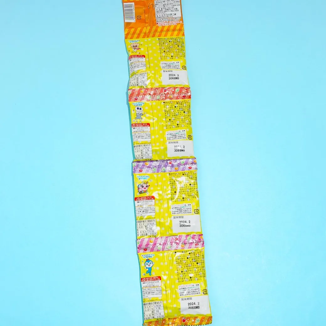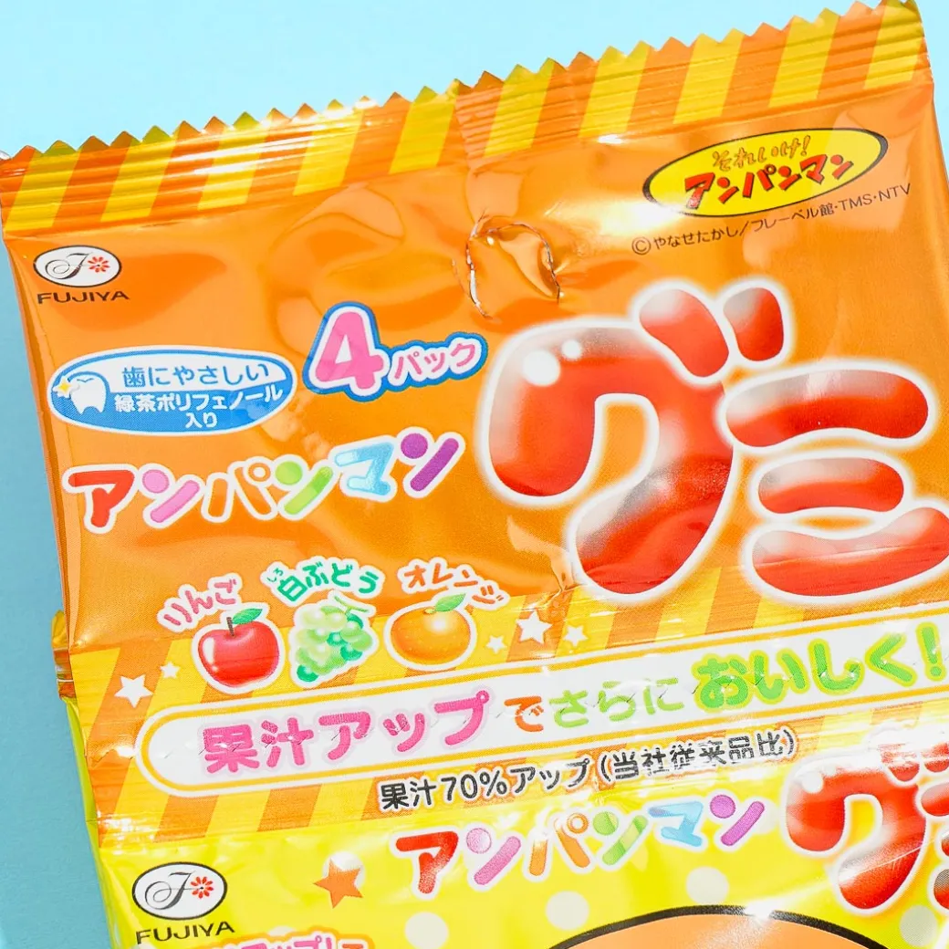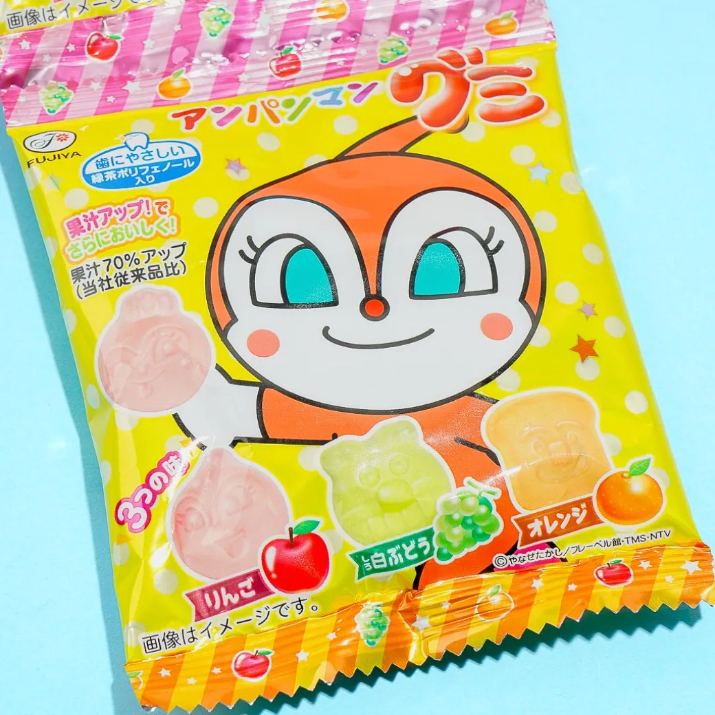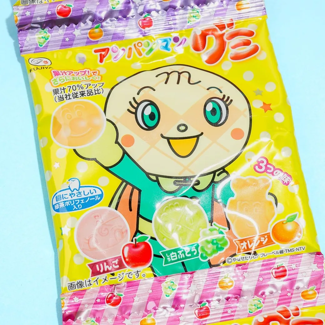 These mini gummy packs are part of the Anpanman 4th series. Each gummy is shaped like an Anpanman character head and tastes like an apple, white grape, or orange.