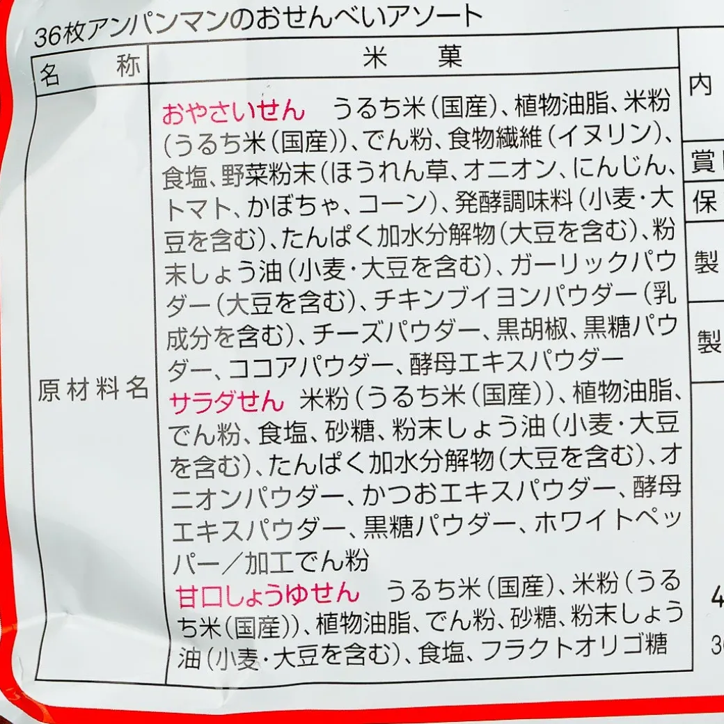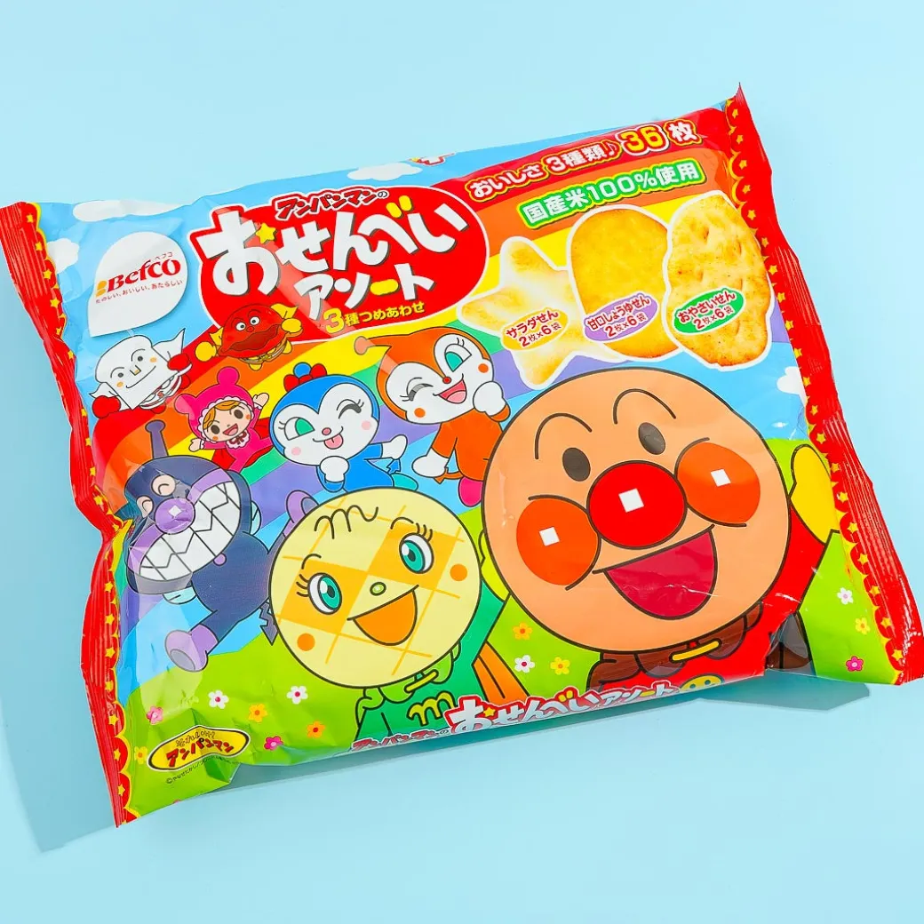 Serve senbei or Japanese crackers at your next party! This snack bag contains three types of rice crackers with different shapes and flavors. The crackers come in individual packaging featuring prints of Anpanman.