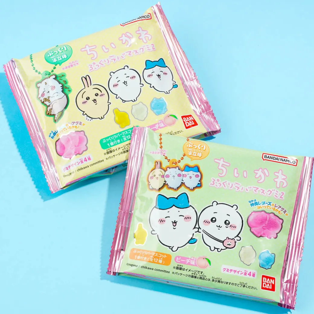 Kawaii-fy your bag with a super cute Chiikawa rubber charm that comes with these yummy gummy candies! The peach-flavored candies are plump and shaped like Chiikawa characters with cute expressions.