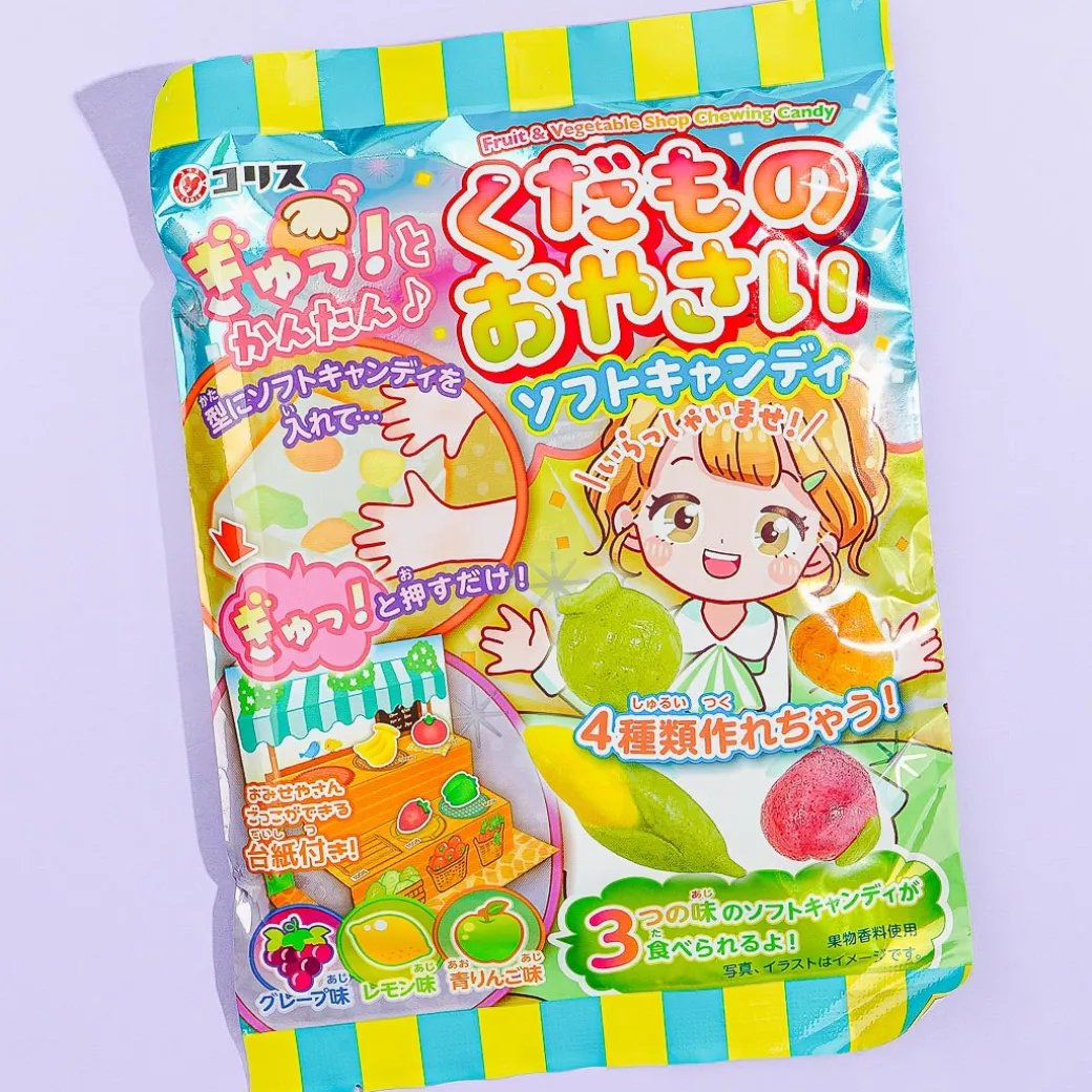 Have fun making fruit and vegetable-shaped candies and pretend you’re in a shop! This DIY candy kit contains a soft candy that you can easily mold like clay. You can make different types of fruit and vegetable, depending on the molding tray you’ll get! There are three pieces of candy with three flavors — grape, lemon, and green apple.