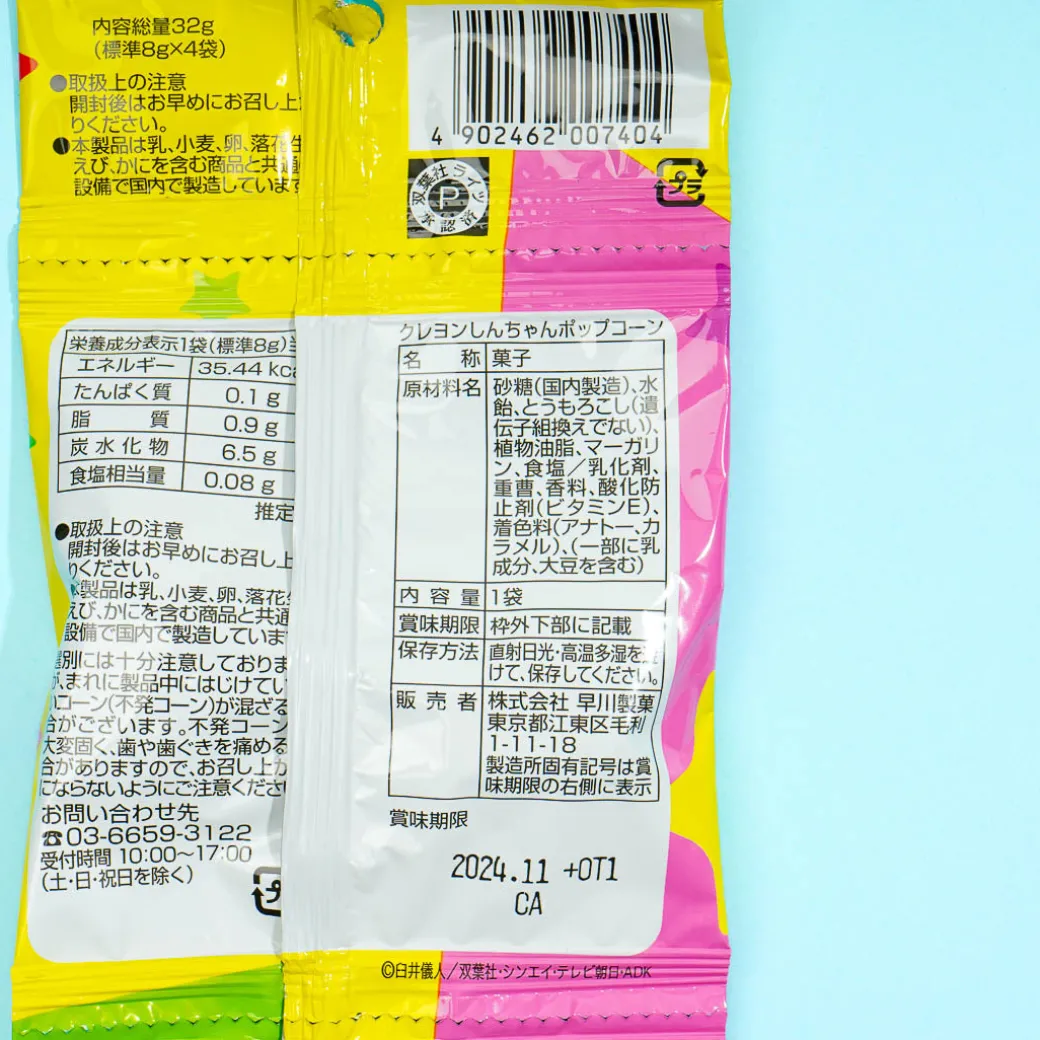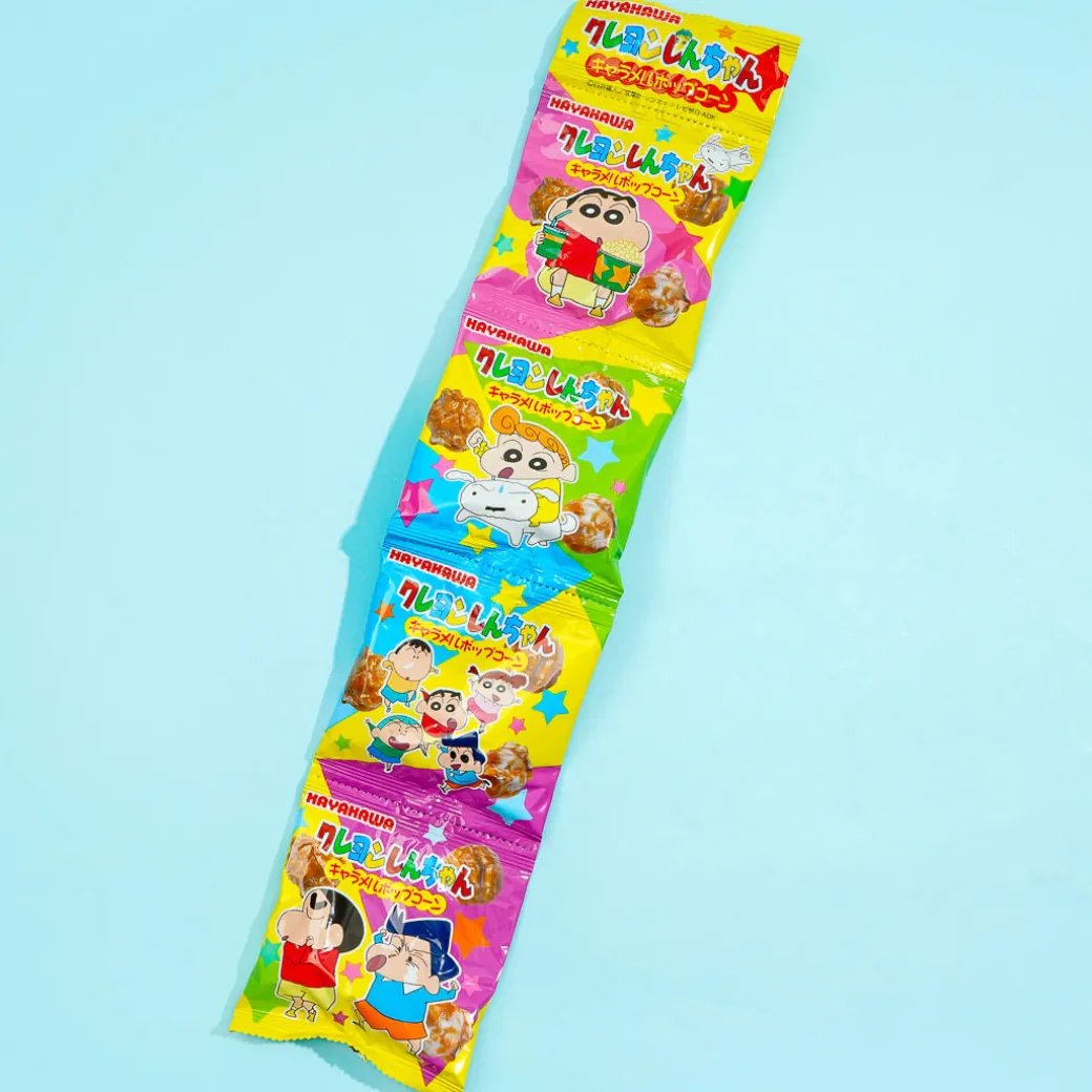 Share these packs of sweet popcorn with your friends! Each crunchy popcorn is coated with delicious caramel. The packaging features illustrations of Crayon Shin-Chan!