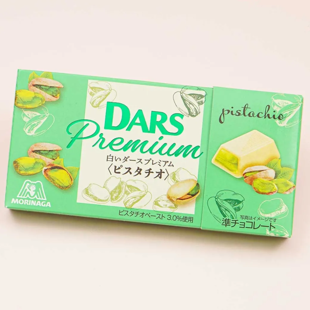 - A box of special-edition white chocolate squares with pistachio cream filling