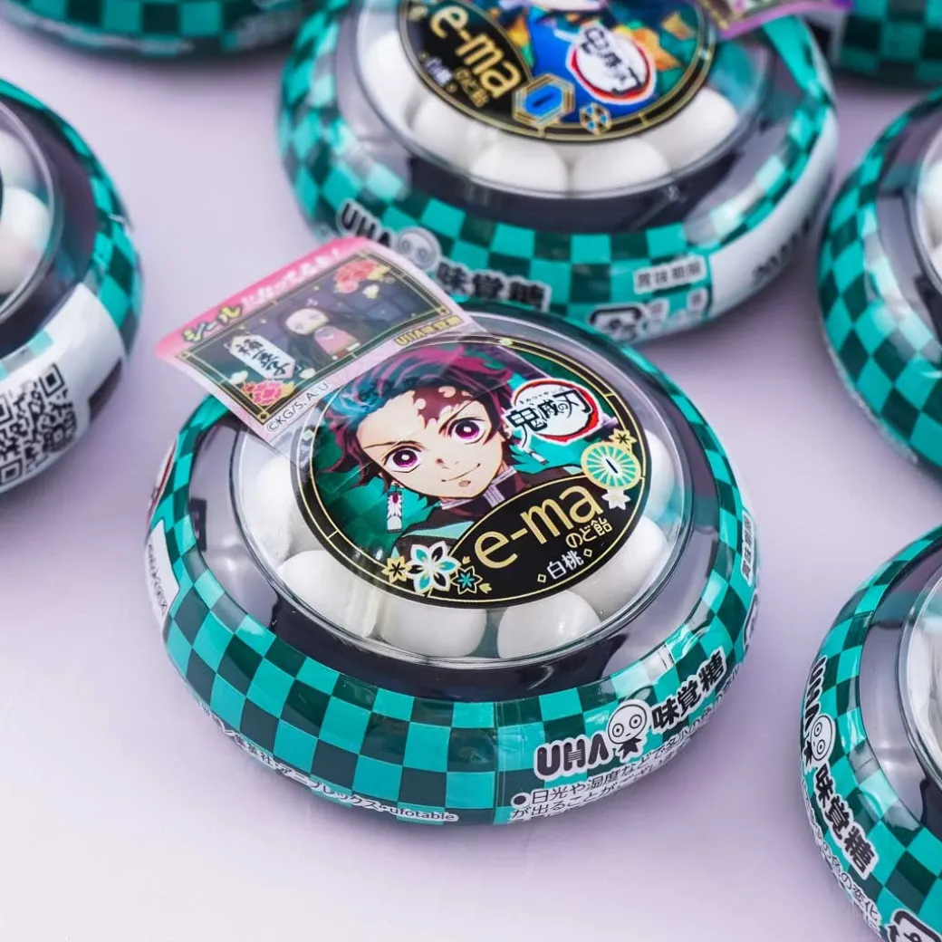 - A case of peach-flavored throat candies featuring Demon Slayer