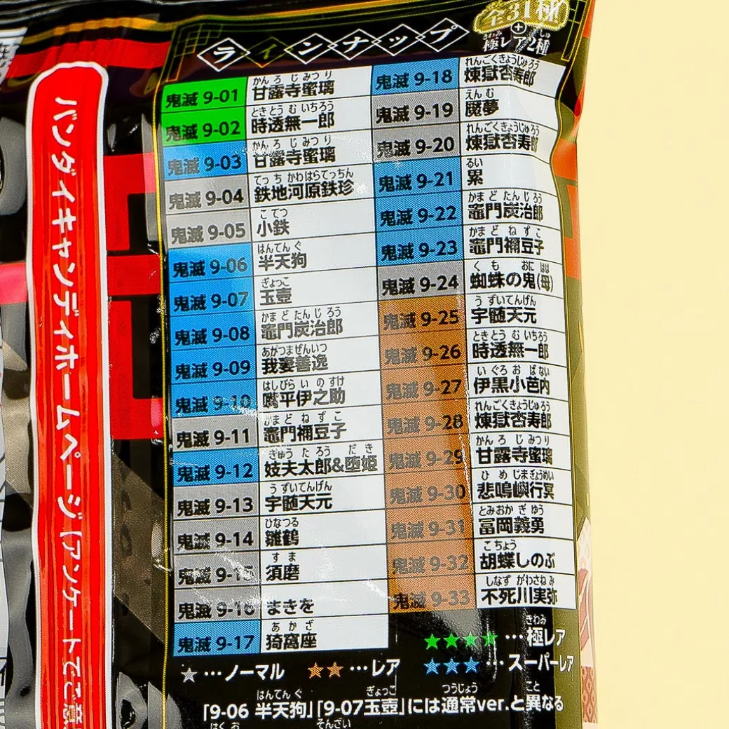 Have fun collecting and decorating with cool stickers featuring the anime Demon Slayer! This 9th edition comes with 33 possible designs and a chocolate-flavored wafer.