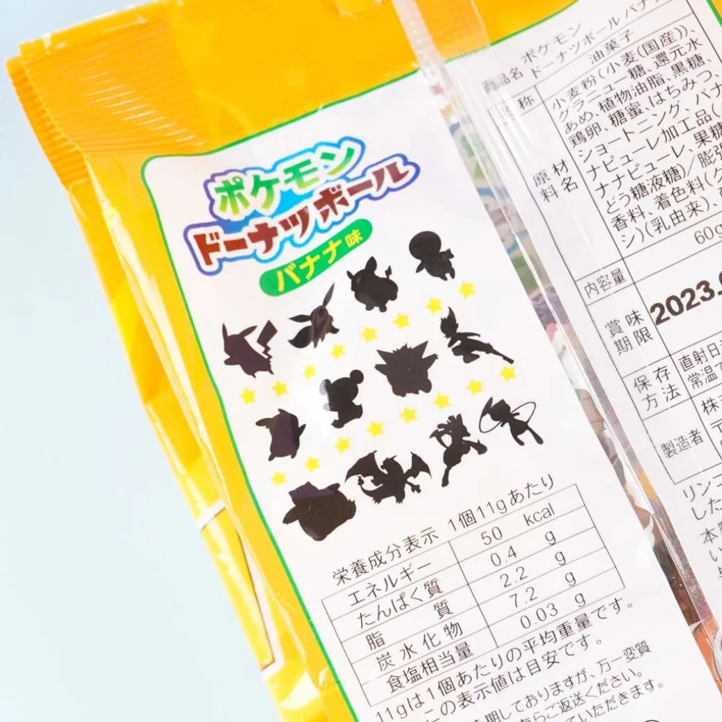 - A pack of banana-flavored donut balls illustrated with Pokemon