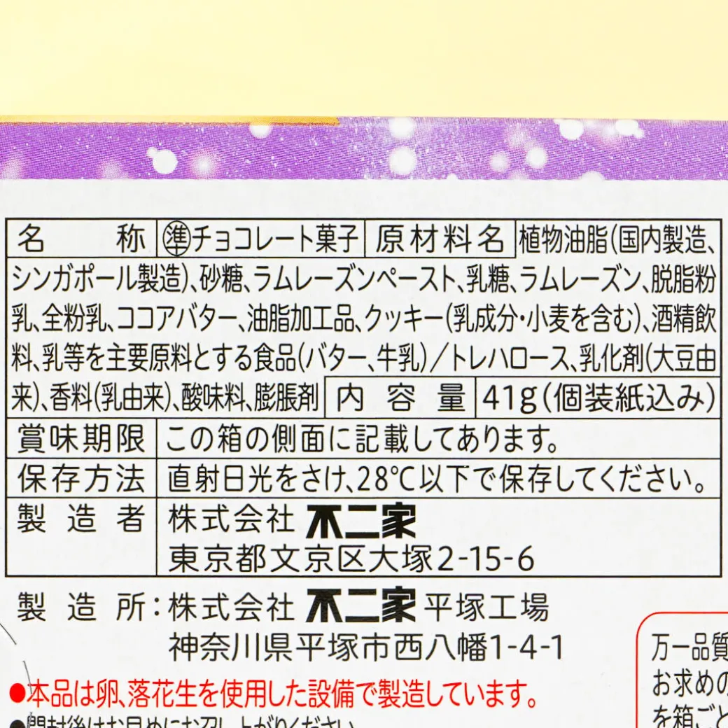 This box of chocolate is inspired by rum raisin butter sandwiches. Indulge in these rich and delicious chocolate treats. Each individually-wrapped piece has 0.4% alcohol and 0.2% butter!